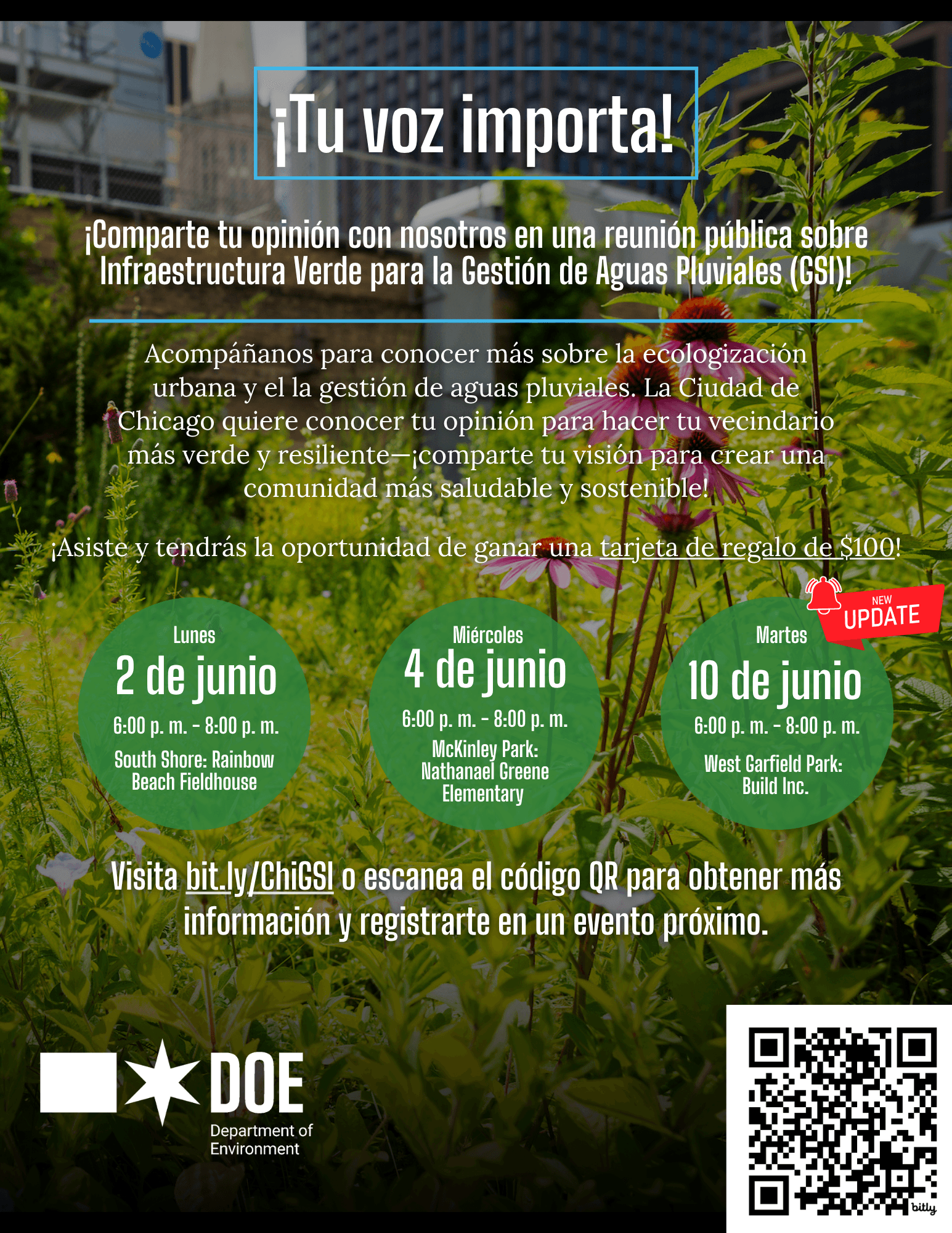The City of Chicago wants your feedback on how green infrastructure can improve your neighborhood. Learn about GSI, explore interactive resource stations, and share your thoughts on urban greening efforts in your community!