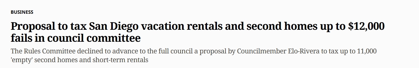 I opposed this Tax when it was first proposed in October for a multitude of reasons. Between legal issues, my concern for middle-class San Diegans relying on their small business income, the potential impact on workers who are hired to care for those rentals, and the inflation it would cause throughout our City, I could not support the ballot measure. I was also uncomfortable with its framing as an ”us versus them” problem, a framing that overrode the need for honest conversations about impacts and implementation issues. This proposal failed 3 votes to 2.