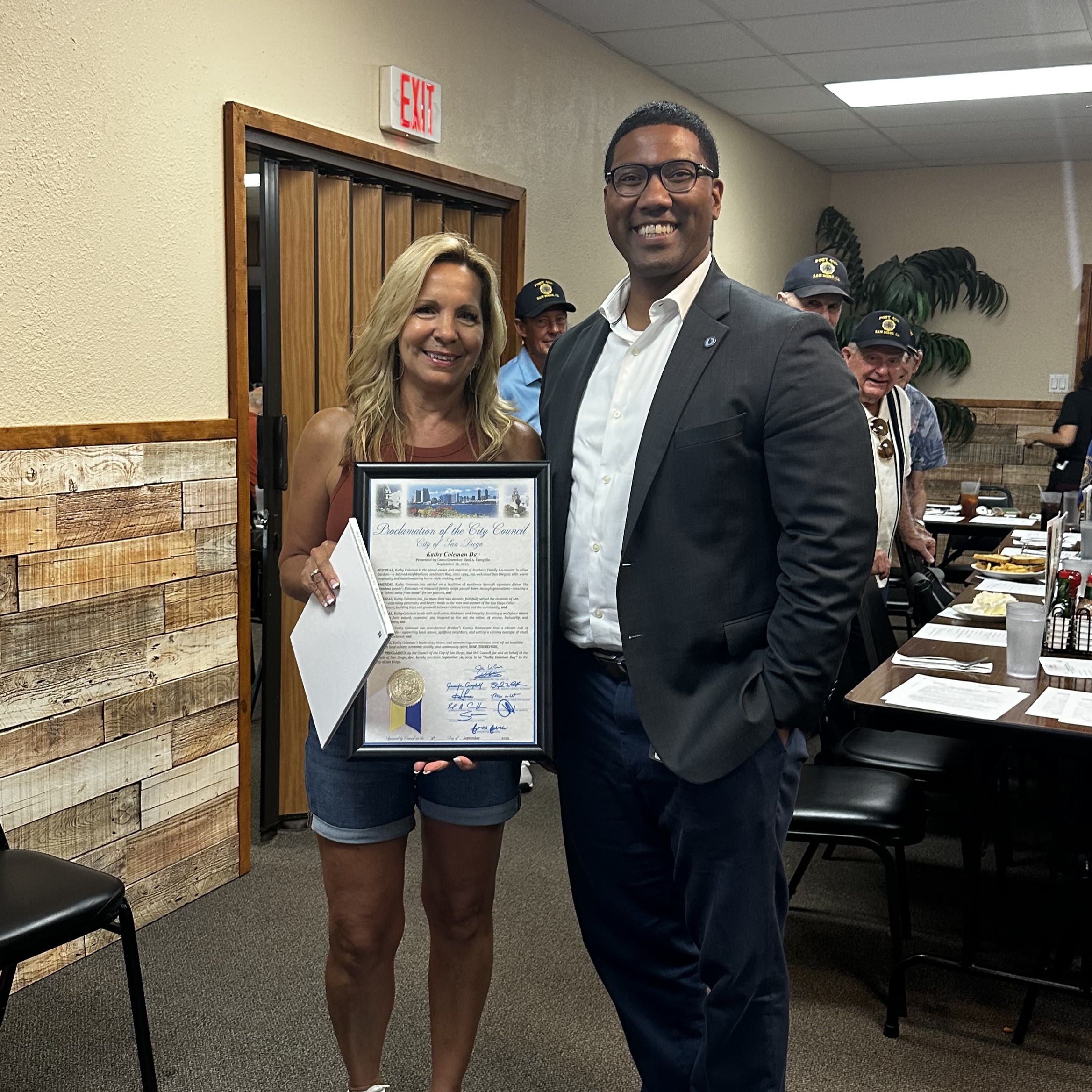 On Tuesday, we proudly recognized Kathy Coleman Day in the City of San Diego! Kathy has been serving up kindness and community at Brother’s Family Restaurant in Allied Gardens since 1994. From ‘Grandma Jennie’s Pancakes’ to her generous spirit, Kathy has created a true home away from home for San Diegans. My Senior Community Representative, Anthony Hackett, proudly delivered the proclamation to Kathy on my behalf. Thank you, Kathy, for more than three decades of warmth and community!