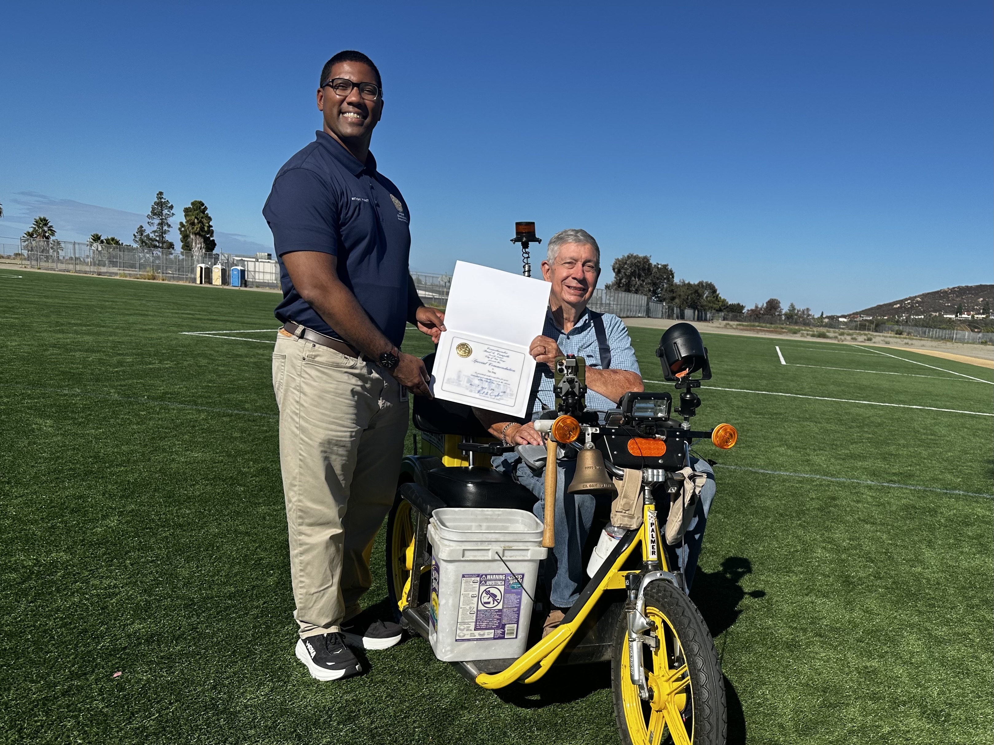 For years, Ted Ortiz has been out at Pershing Middle School and Gage Elementary with his yellow cart and picker stick, keeping the fields clean and returning lost items like soccer balls and cones. Recently, my Senior Community Representative Anthony Hackett had the honor of presenting Ted with a special commendation for all the great work he has done for our community. Thank you, Ted!