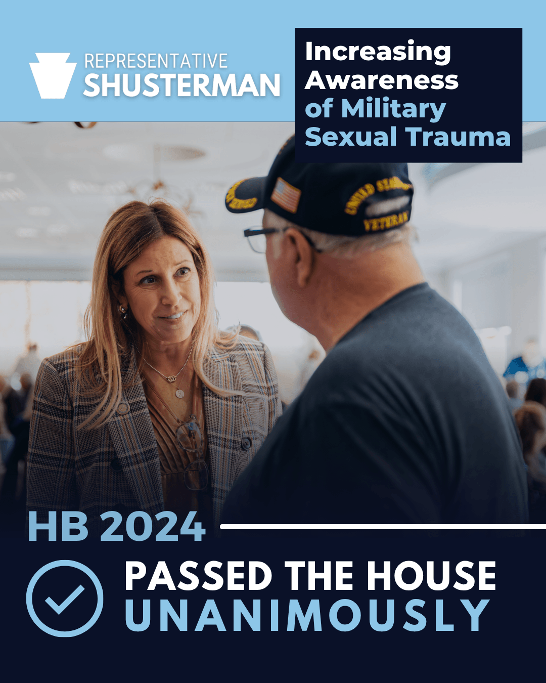 Last week my bill, HB 2024, passed out of the House unanimously and is now headed to the Senate! My bill ensures that our Commonwealth adequately prepares our County Veteran Affairs Directors to provide trauma-informed care, including military sexual trauma (MST), PTSD and traumatic brain injury to our veterans. We owe it to our veterans to see that the staff supporting them are best equipped to meet their needs.