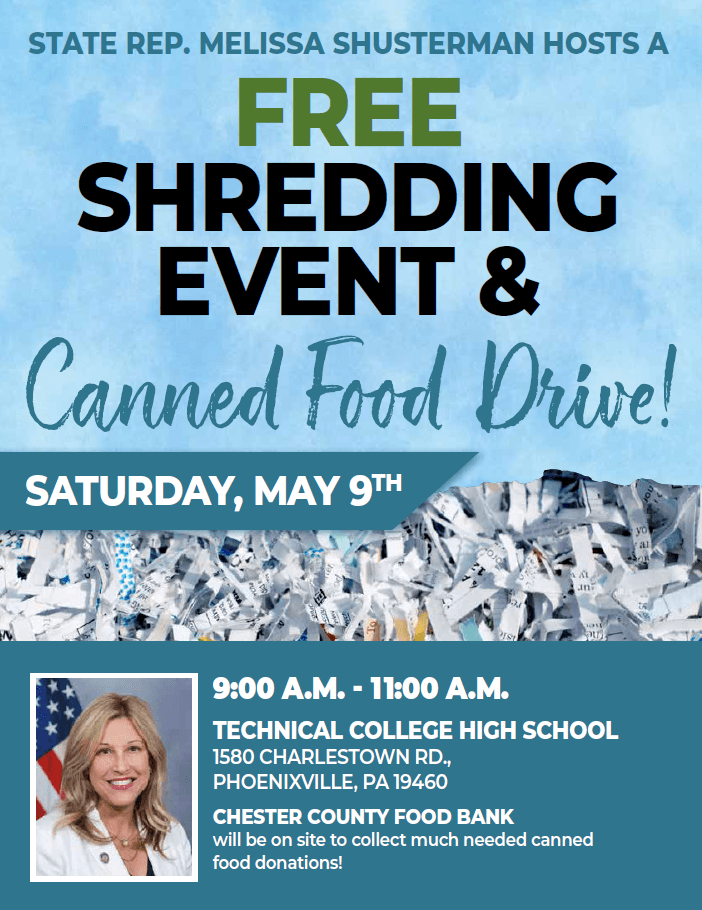 My spring shredding event will take place on Saturday, May 9th from 10 AM - 1 PM at the Pickering Technical College HS in Phoenixville. The Chester County Food Bank will be onsite to collect canned goods. Let us help you safely and securely dispose of your important documents!