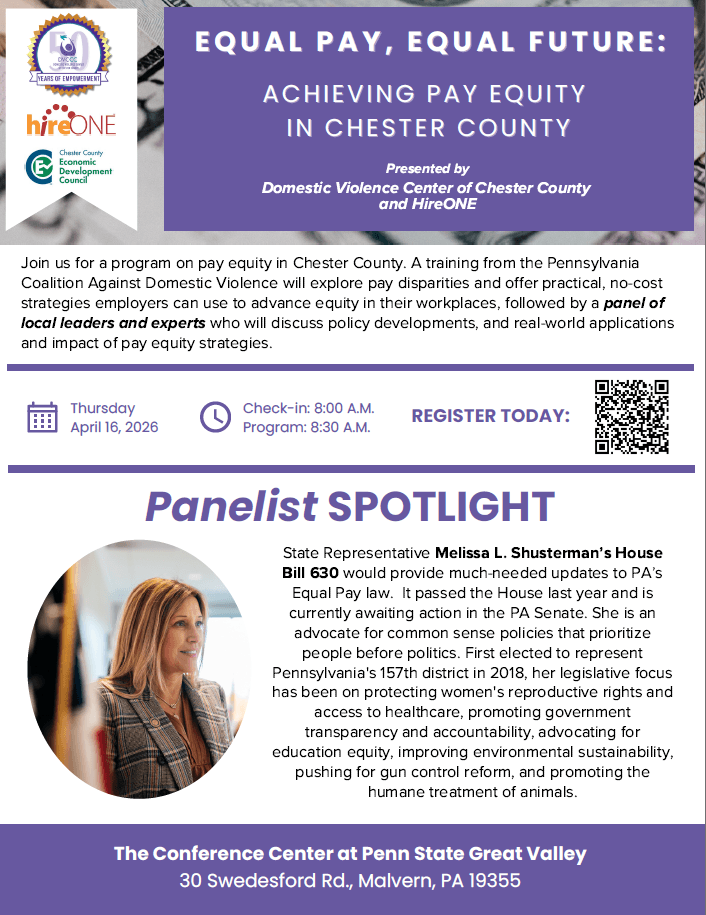 On April 16th, I am joining the Domestic Violence Center in Chester County and HireONE to discuss the importance of Equal Pay. I will be taking part in a panel to discuss the real-life impacts implementing equal pay would have on our community. If you are interested in attending, register today!