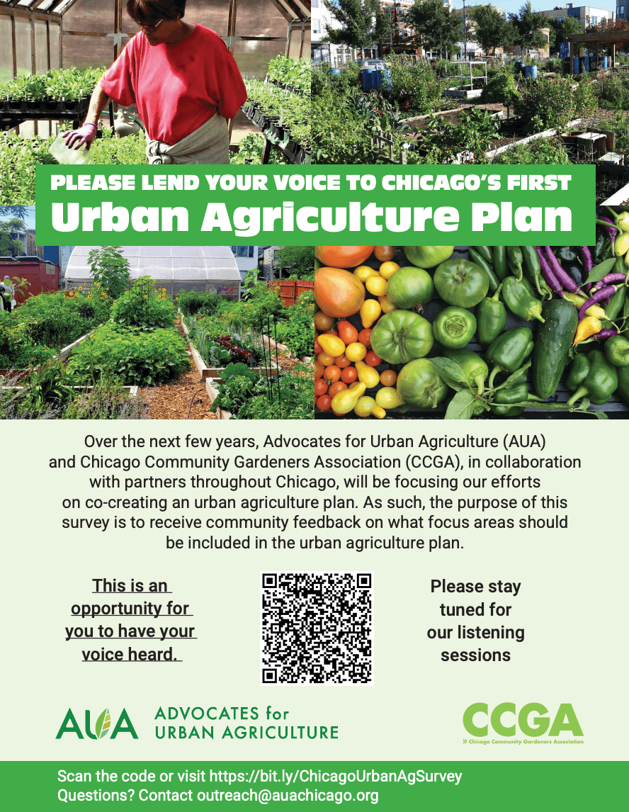 Lend your voice to Chicago’s first Urban Agriculture Plan. Over the next few years, Advocates for Urban Agriculture (AUA) and Chicago Community Gardeners Association (CCGA), will be focusing their efforts on co-creating an urban agriculture plan. The purpose of this survey is to receive community feedback on what focus areas should be included in the urban agriculture plan. We endeavor to shift policy to reduce red tape in the City to be more supportive of individuals, organizations and businesses growing food, medicine, flowers, and other pollinator habitats within the city; identify challenges within departments of the City of Chicago and sister agencies to better serve growers; and encourage improved resources.
