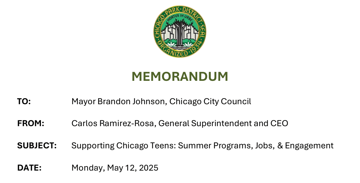 The Chicago Park District Teen Programs Memo, which outlines the Park District's summer youth engagement strategy, including teen-focused programs, events, and employment opportunities across the city.