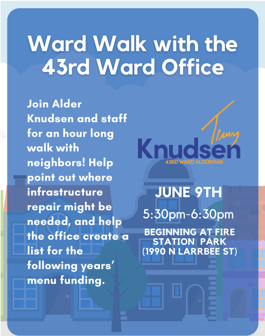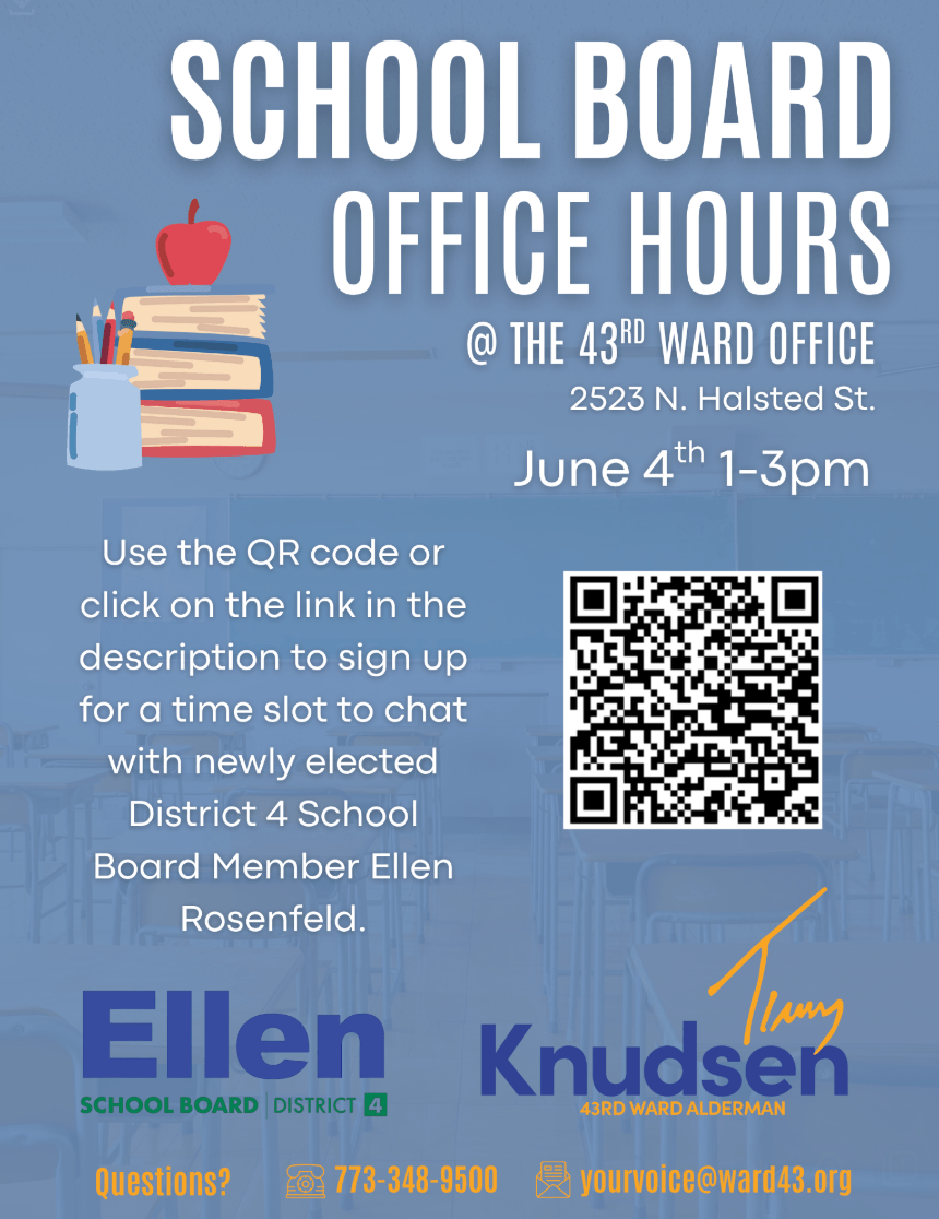 P.P.S. On Friday, May 23th at 2pm, The 43rd Ward office will close for Memorial Day Weekend, and will reopen on Tuesday, May 29th at 9am. Saturday Office hours on May 24th will not be available over the holiday weekend.