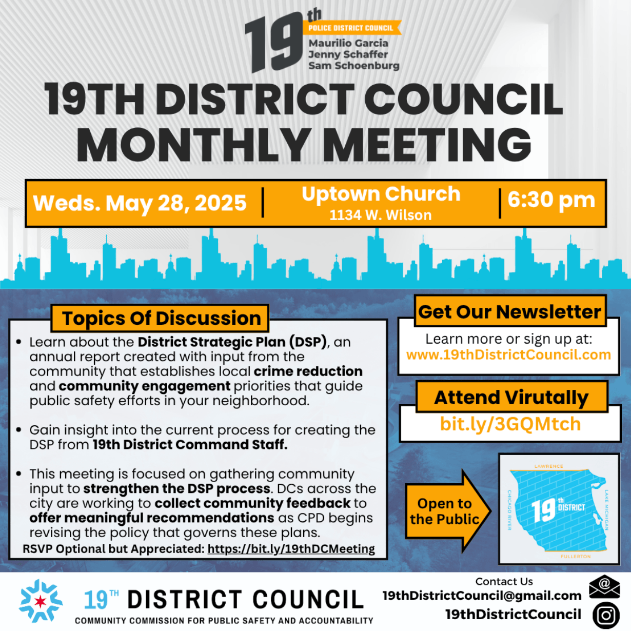 Beat Meetings are part of the Chicago Alternative Policing Strategy and an excellent way to hear directly from CPD about your neighborhood. Meetings are held in the evenings every two months. Click here and find out your Police District and Beat number.
