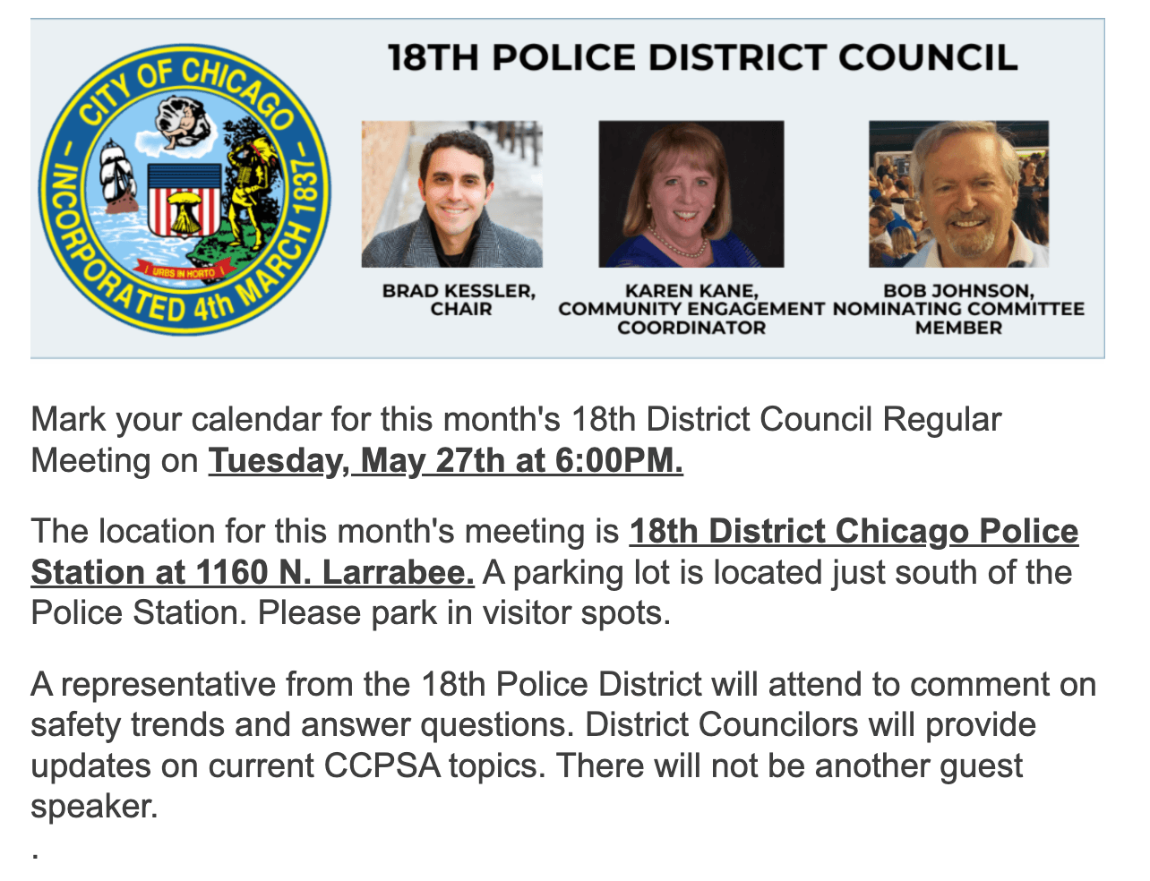 We work closely with the 43rd Ward’s local CAPS districts, which include the 18th (Near North) and 19th (Town Hall) Police Districts. Our office is in frequent contact with officers from both of these districts and their local CAPS officers, who host a variety of community forums and events including beat meetings, informational settings, and expert panel discussions, as well as sending out community alerts when a pattern of crime is detected.