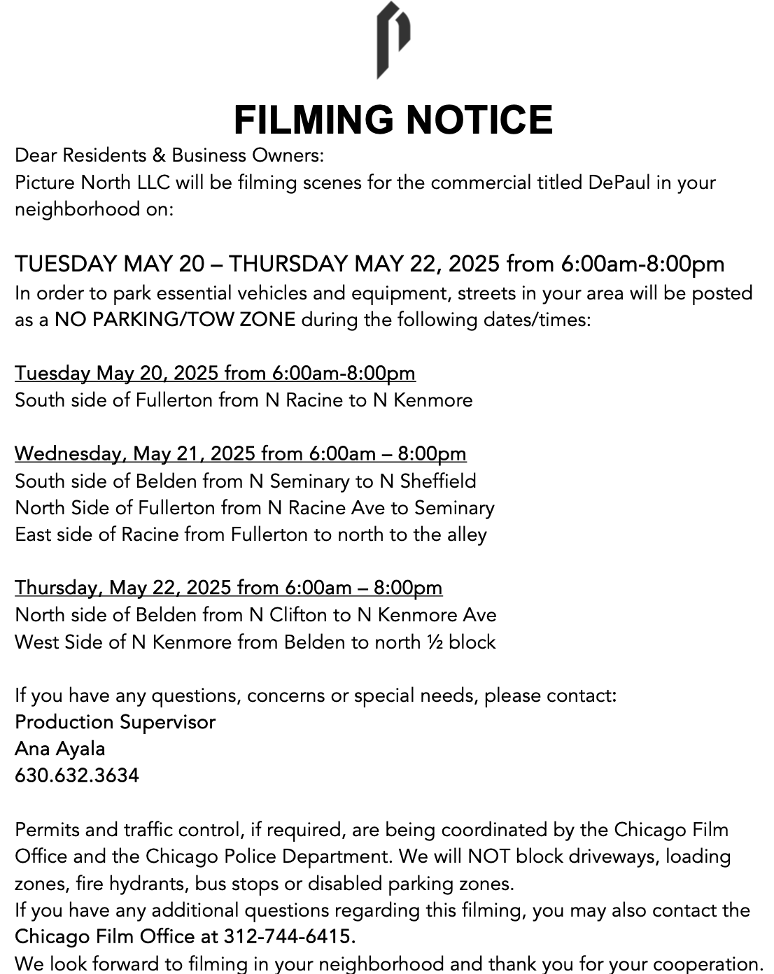 Filming for a commercial for Depaul Univ. will be in your ward next week at various campus locations. Attached for your reference, please find the notification leaflet that the production will distribute to residents and businesses in the affected area. The Film Office will always work with all your community feedback, questions, and concerns, so please direct any responses from your office or constituents to our office for quick resolutions. If you have additional questions regarding this or other filming in Chicago, they may contact the City of Chicago Film Office at 312-744-6415.