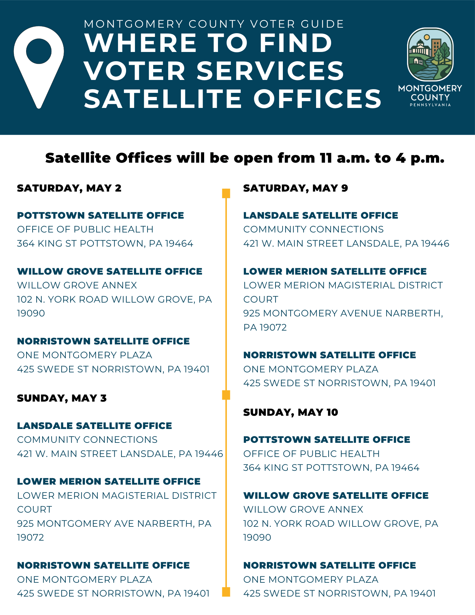 The Norristown office will also be open 11 AM – 4 PM on May 2, 3, 9, and 10, in addition to regular weekday hours.