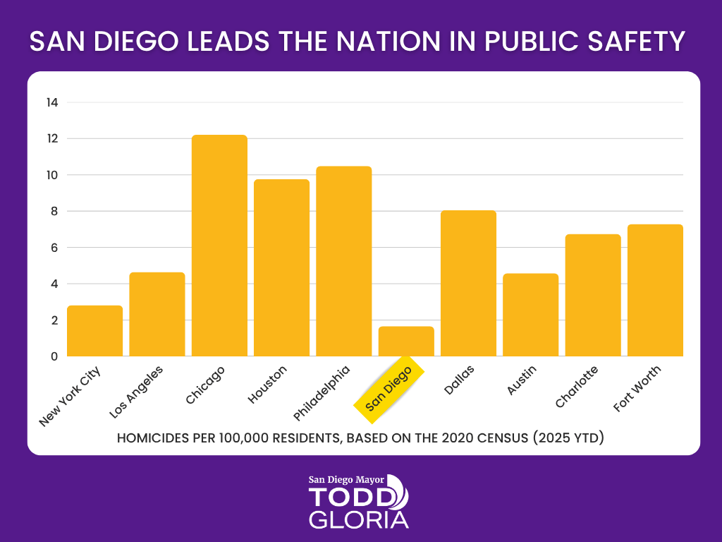 This achievement reflects the daily dedication of our San Diego Police Department officers, our community partners, and residents across the city who look out for one another. Their collective effort is what makes San Diego one of the safest places in the nation to live, work, and raise a family.