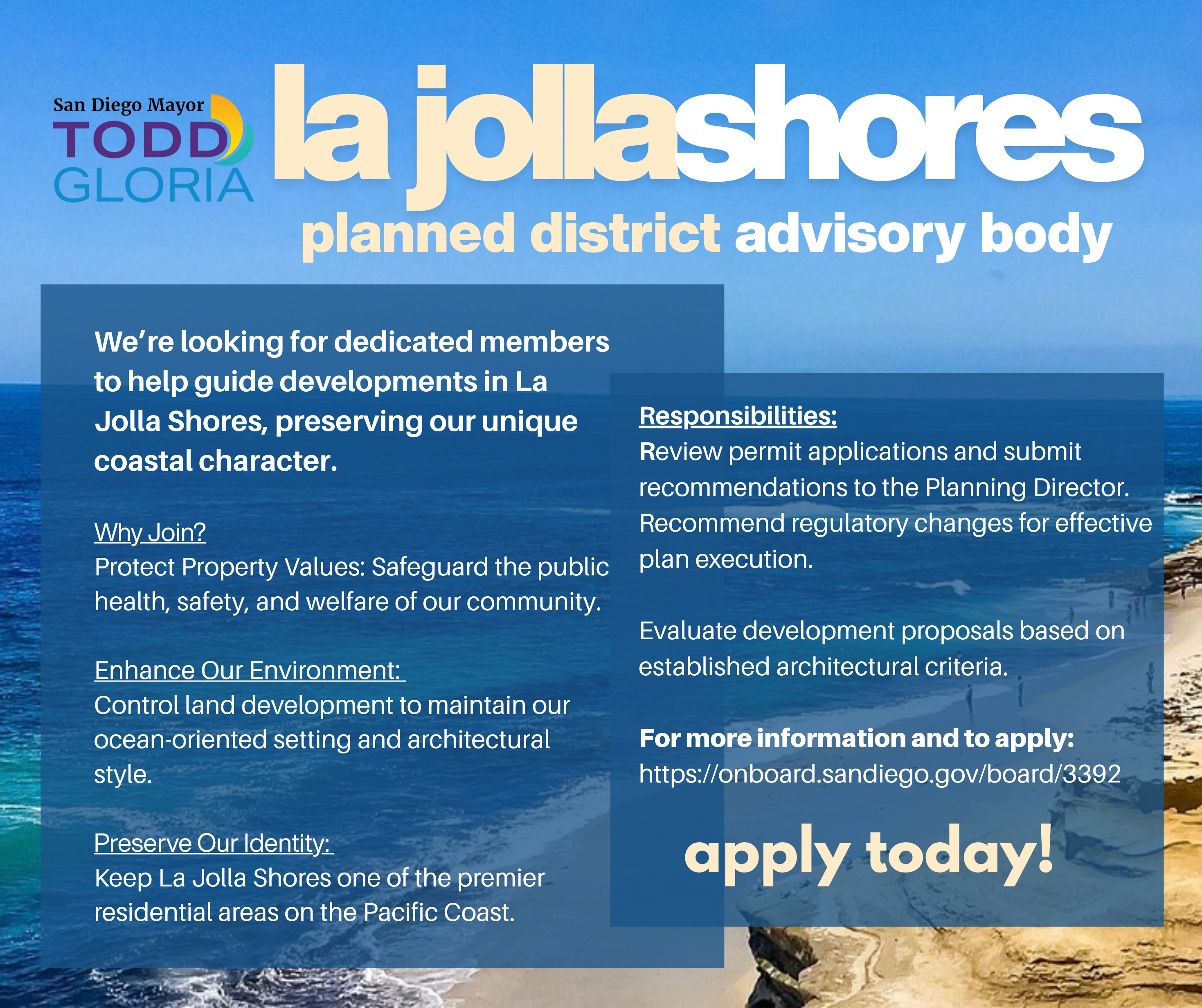 We invite you to consider joining the La Jolla Shores Planned District Advisory Board. This is a unique opportunity to contribute to the future of our beloved community while helping to preserve its distinctive character.
