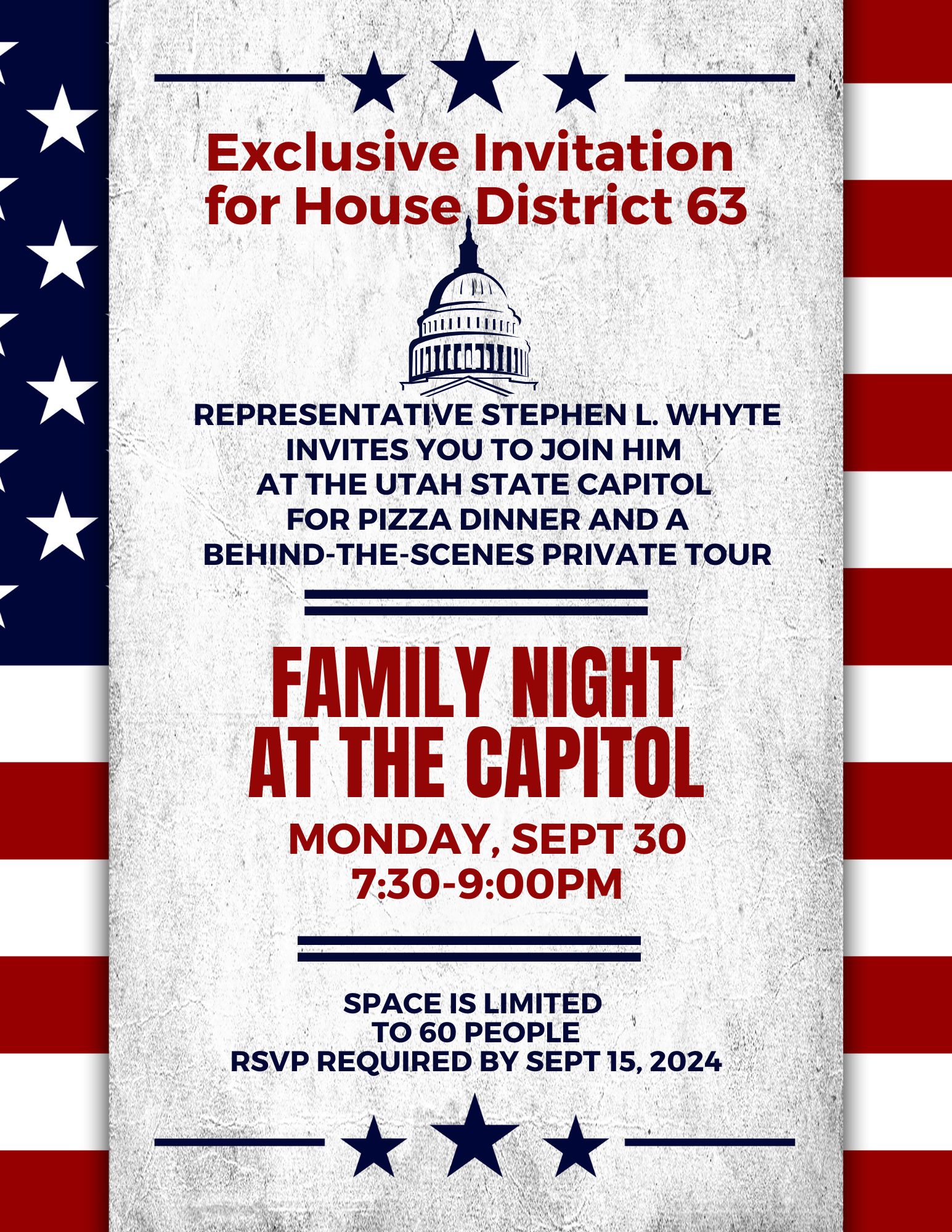 Back by popular demand and in follow up to the Family Night at the Capitol I hosted earlier this year, you are invited to attend a fall Family Night at the Capitol on September 30, 2024, for a pizza dinner and a behind-the-scenes private tour.