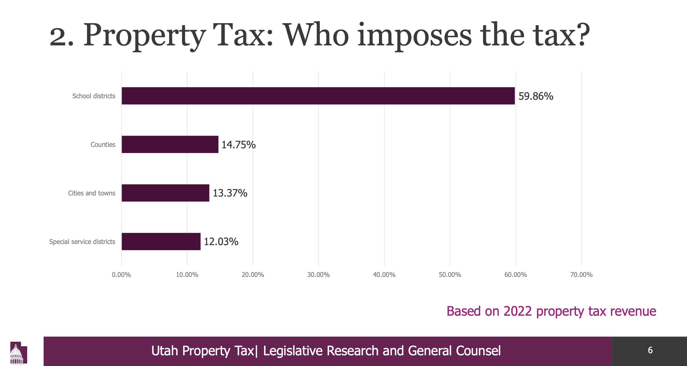 A screenshot from this presentation shows which organizations determine our property taxes. Before property taxes are set, it is required that a “Truth in Taxation” hearing be held so we can all share our ideas, concerns, and recommendations. It is our opportunity and responsibility to be involved in these important decisions. Many of these meetings were held in August and have been covered by the press. It is also never too late to share your recommendations with members of our City Councils, Mayors, Nebo School District Board Members, and County Commissioners.