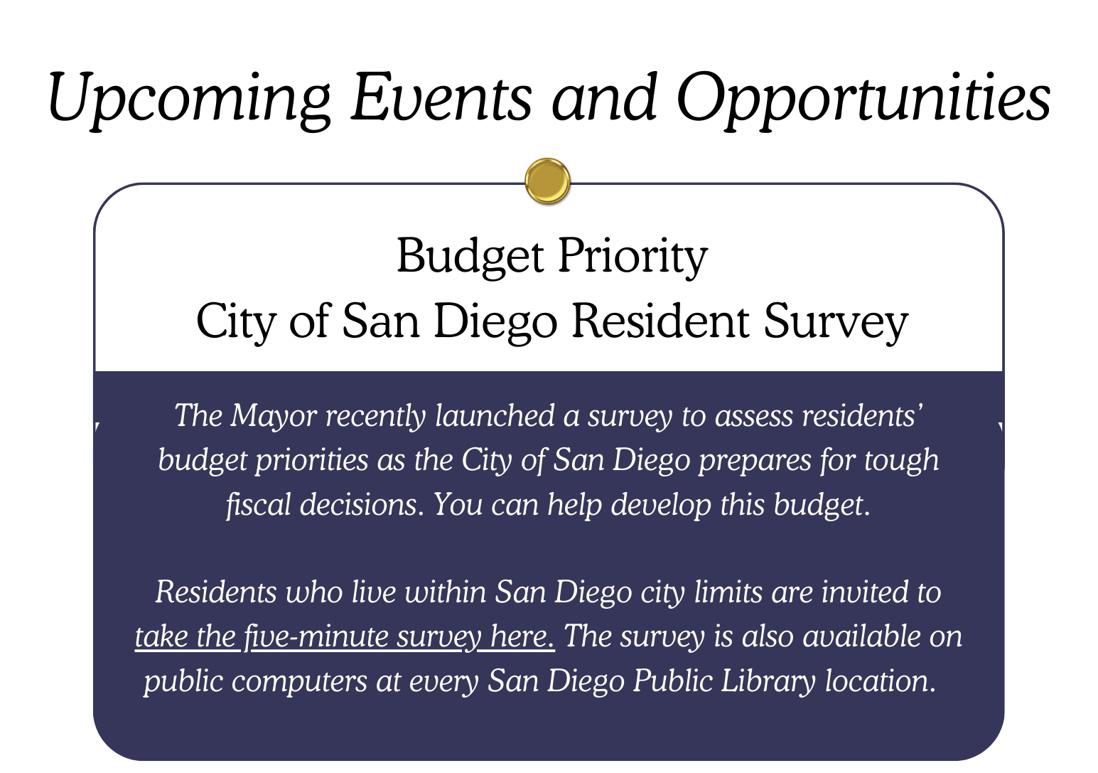 By the time that you receive this, I will have already hosted a Linda Vista Town Hall and will be gearing up to host my last Town Hall in Serra Mesa. You can attend that tonight, Tuesday, March 3 at 6:30pm at the Serra Mesa-Kearny Mesa Library. Thank you to everyone who has attended so far. Your participation and interests are critical to my role as your Councilmember.