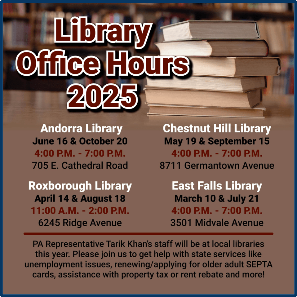 The Chestnut Hill East and West stations are a 10-minute walk apart, and Route 23 remains a frequent bus option with direct access to Center City. 📍 Plan your trip at plan.septa.org. | Image: SEPTA graphic for Chestnut Hill East repair closure | UPCOMING COMMUNITY EVENTS | | 📚 Join my Staff Tonight for Library Office Hours at the Andorra Library! | Need help with state services? PennDOT paperwork, rent rebates, or any other issue, our team will be on hand to assist—no appointment needed! Monday night our staff will be at the Andorra Library (705 E. Cathedral Road) TONIGHT June 16th, 4 pm - 7 pm. Come by if you are free! | Image: Flyer with information for each of the upcoming office hours | COMMUNITY UPDATES Follow us on Social Media FB/Twitter/TikTok: @RepTarik Insta/Bluesky: @RepTarikKhan | Pennsylvania State Capitol 121-A East Wing Harrisburg, PA 17120 (717) 783-4945 | District Office 4001 Main St., Suite 101 Philadelphia, PA 19127 (215) 482-8726 | |