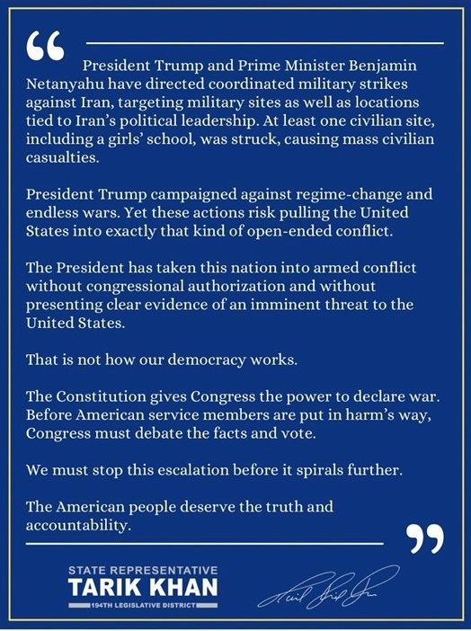 In this newsletter, I’m sharing concerns on the war with Iran and the constitutional questions it raises, my legislation to protect houses of worship, raising the minimum wage and other updates on state budget hearings, ways to improve traffic safety, and new opportunities for students and families.