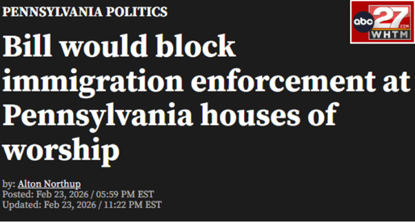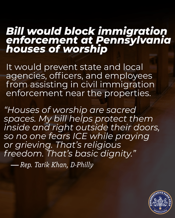 That is why my colleagues and I introduced legislation this week that would prevent immigration enforcement actions inside houses of worship in Pennsylvania.