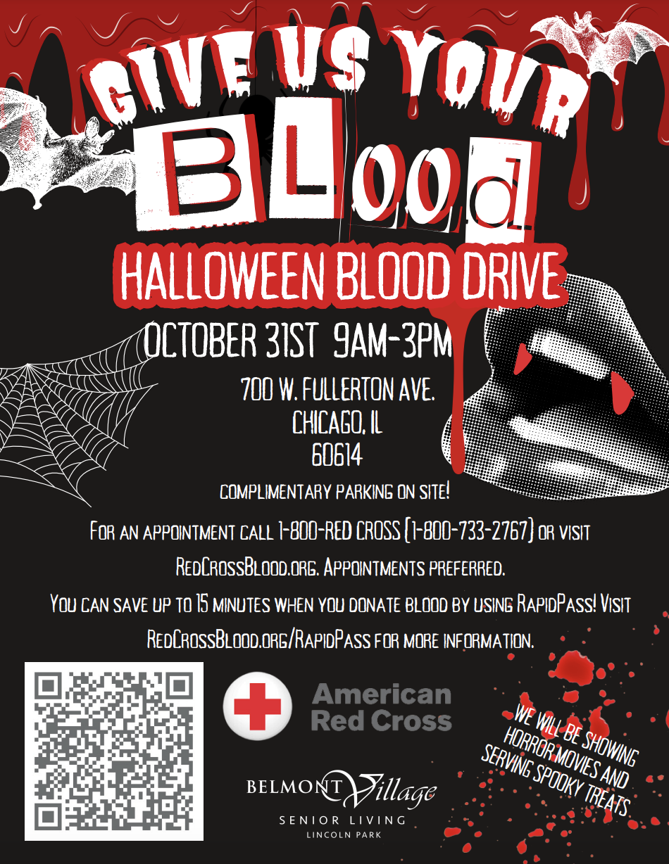 On October 31st, join Belmont Village in a blood drive at 700 W Fullerton Ave from 9am-3pm. Click here for more information.