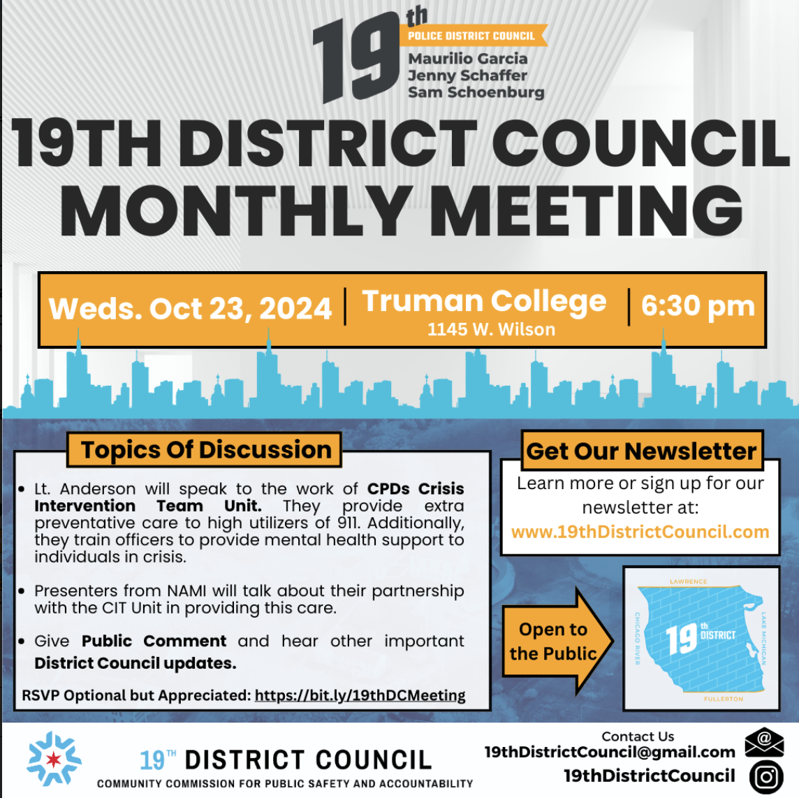 We work closely with the 43rd Ward’s local CAPS districts, which include the 18th (Near North) and 19th (Town Hall) Police Districts.