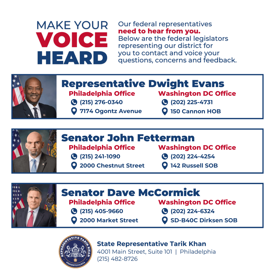 Good Morning Neighbors! Raising wages & protecting workers are two big issues I care about. 💰👷 In the past week of budget hearings, our Appropriations Committee explored raising the minimum wage, growing well-paying careers, keeping workers safe, supporting older adults, investing in mental health, & protecting our environment. See what our great commonwealth is up to below! | Costs continue to rise, and nobody can live on a $7.25 poverty minimum wage. I spoke with PA Labor Secretary Walker about raising the wage to at least $15 and indexing the minimum wage to inflation. We also discussed my bills to fund security investments for transit and hospital workers. | We can be proud of our Philadelphia City Council and those advocates who worked to demand (and fund) the implementation of lead-filtering hydration stations at all Philly schools. Councilmember Helen Gym and Penn Environment teamed up to create legislation in 2022, and today all Philly schools have at least three lead-filtering hydration stations. However, other kids across PA are still drinking water with lead. Last week, I held a hearing to discuss my bipartisan bill with PA Rep. Roni Green to require all schools to have lead-filtering water fountains and have our government fund lead removal in all PA schools. Click on the photo below to see a clip of our hearing! | Image: Photo of me, asking a question during Education hearing | | 988 & Supporting the Mental Health of our Community | 988 is the emergency # people can call during a mental health crisis, including considering suicide. I spoke with the PA Secretary of the Department of Conservation and Natural Resources (DCNR) about posting the 988 number and other suicide prevention resources in all state parks and forests. My bipartisan bill would ensure this happens. Click on the image below to see a clip of our conversation. | Image: Photo of me, asking a question during DCNR hearing | | Holding Corporate Polluters Accountable | The recent fire at SPS Technologies in nearby Jenkintown, PA was concerning, especially because of the potential threat it posed to neighbors and the environment. I’m working on a bill that would ensure that corporations and other entities responsible for potential environmental disasters notify residents within hours of the incident and receive hefty fines for the damage they cause to our communities. Last week, I spoke with the PA Secretary of the Department of Environmental Protection, Jessica Shirley, about keeping neighbors safe during environmental disasters. Click on the photo below to see a clip of our conversation. | | Supporting Families Living with Alzheimer's & Other Dementias | PA Department of Aging Secretary Jason Kavulich and I spoke last week about the new division in the Department of Aging that PA House Aging Committee Chair Maureen Madden and I created with our legislation that Gov. Josh Shapiro signed into law last year. The division is progressing and will soon be able to support families dealing with Alzheimer’s and other related dementias. We also briefly discussed another program I am trying to create with State Rep. Andre Carroll, which would codify the SHARE housing program in Pennsylvania, helping older adults and young adults secure stable housing. Click the photo of the Secretary and me below to hear our discussion! | Image: Photo of me and Secretary Kavulich, walking down the Manayunk towpath | | Talking Labor & Legal Issues with East Falls’ Own Joe Dougherty! | I recently spoke on WWDB Talk 860 with East Falls own host Joe Dougherty and attorney John Zervanos for an hour-long show on labor and health care issues. We had a wide-ranging talk about my bills around protecting hospital and transit workers, $15 minimum wage, safe nursing staffing, and preventing future community hospital closures like MCP and Hahnemann. Click on the image of me below to hear the podcast here.  | Photo Credit: Tommy Tucker, Chestnut Hill Local | | More Teen Job Opportunities! | Our office helped to secure a $90,000 federal grant that will allow over 50 kids to get summer internships through North Light!! These work experiences will help kids 13-16 develop critical skills, including leadership & financial literacy! | Image: Packing meals with my mom last year at North Light North Light is also now an approved site for issuing work permits to teens aged 14–17! Now kids in our community have better access to connecting to job opportunities! For more details, visit North Light Community Center's Teen Services. | Image: Flyer with information about North Light’s CIT program | Family Practice and Counseling Network is hosting a free health fair for older adults. The Philadelphia Corporation of Aging, Senior Law, CARIE & Innovage will be there to talk about their services. Free Older Adult Care Packages! | Wed. March 5 from 11am-1pm 4700 Wissahickon Ave., Building D (South Abbotsford Avenue & Wissahickon Avenue) Contact: Amika Miller (215) 667- 1286. | Image: Flyer with information about Senior Support Day Event | | Who Represents You in Washington? | Big decisions are being made in Washington that impact our community—from public school and healthcare funding to federal grants. If you have concerns about federal programs or policies —I know do— our office has put together a flyer with key contact information (see below). Whether it’s about recent government actions or issues like Social Security, Medicare, or veterans' benefits, contacting your federal elected officials is an important way to make your voice heard! | Image: Flyer with information about federal government contacts | COMMUNITY UPDATES Follow us on Social Media FB/Twitter/TikTok: @RepTarik Insta/Bluesky: @RepTarikKhan | Pennsylvania State Capitol 121-A East Wing Harrisburg, PA 17120 (717) 783-4945 | District Office 4001 Main St., Suite 101 Philadelphia, PA 19127 (215) 482-8726 | |