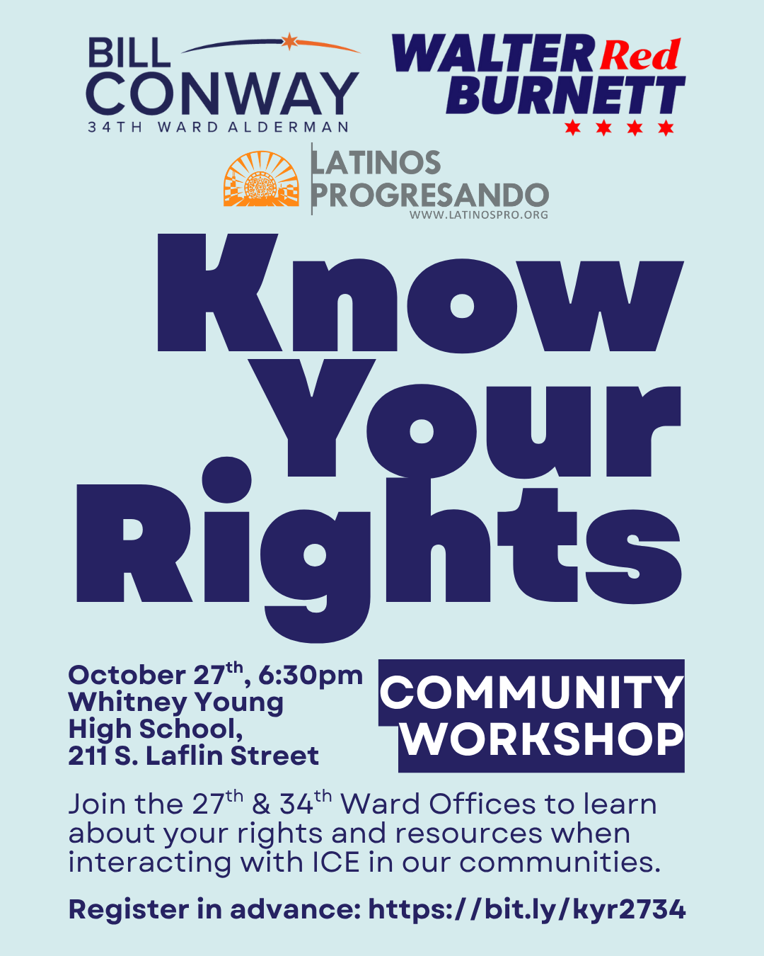 I am partnering with Ald. Walter Redmond Burnett and Latinos Progresando for a 'Know Your Rights' training on Monday, October 27th at 6:30pm at Whitney Young High School. This event will be an opportunity to learn more about what's happening and how to engage safely with ICE. Please register below and I hope to see you there.