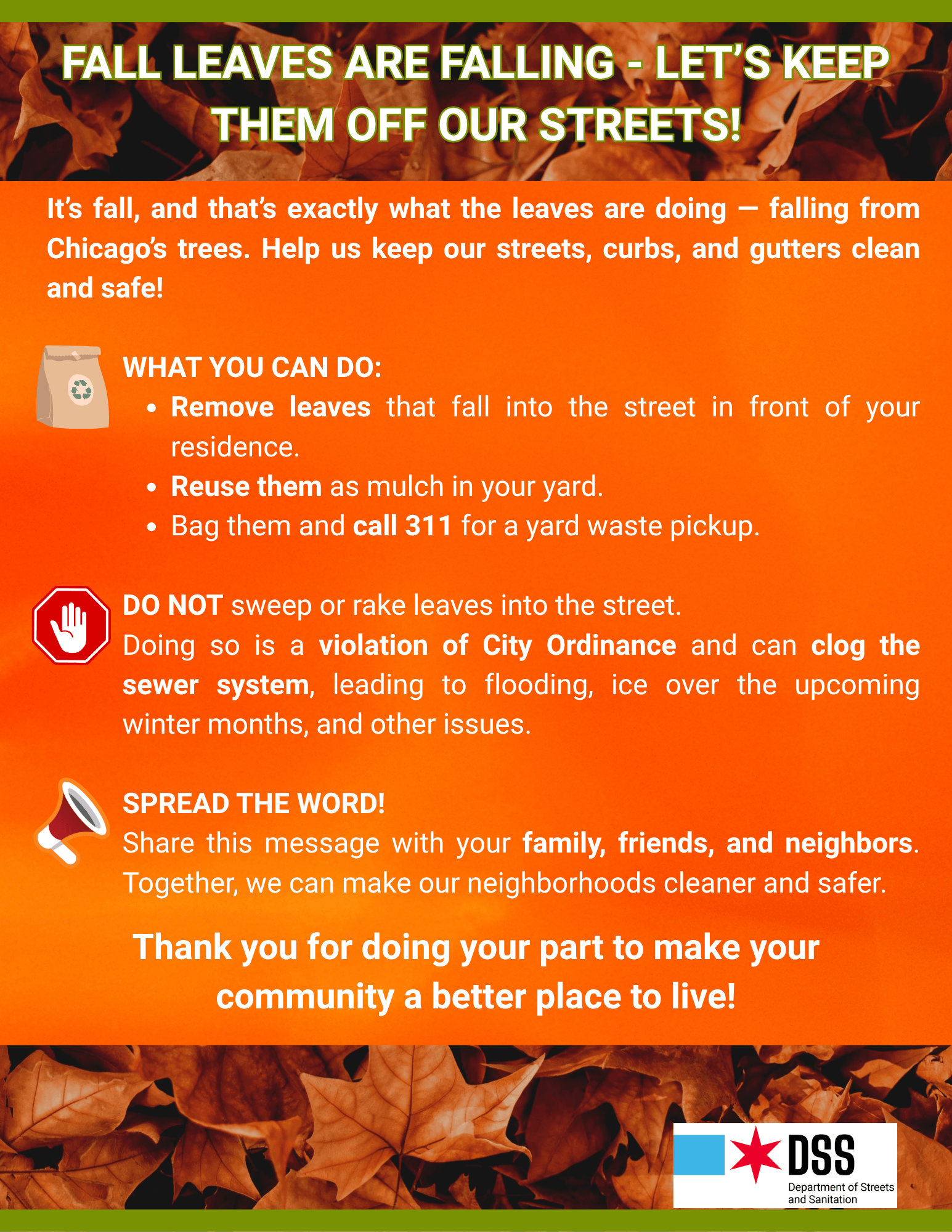 Street sweeping is underway! Find a map and scheduled dates here. Be sure to move your vehicle on your posted street sweeping dates to avoid getting ticketed or towed. As leaves fall, please do not sweep them into the street. That is not only a violation of City Ordinance, but can lead to flooding and icy conditions during the winter months.