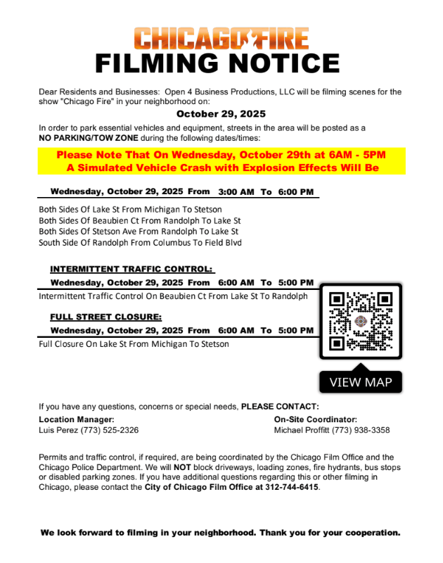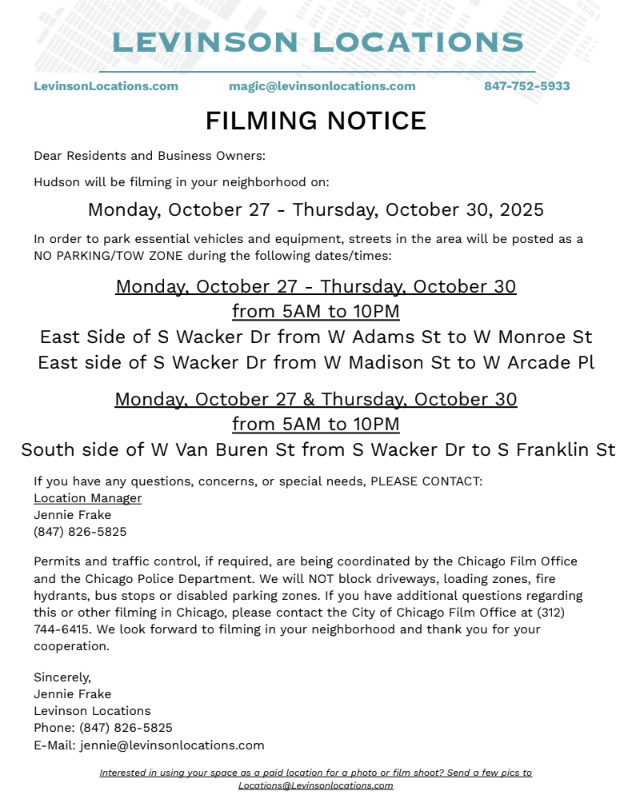 - The week of October 27th, the northern sidewalk will be closed for ComEd work.