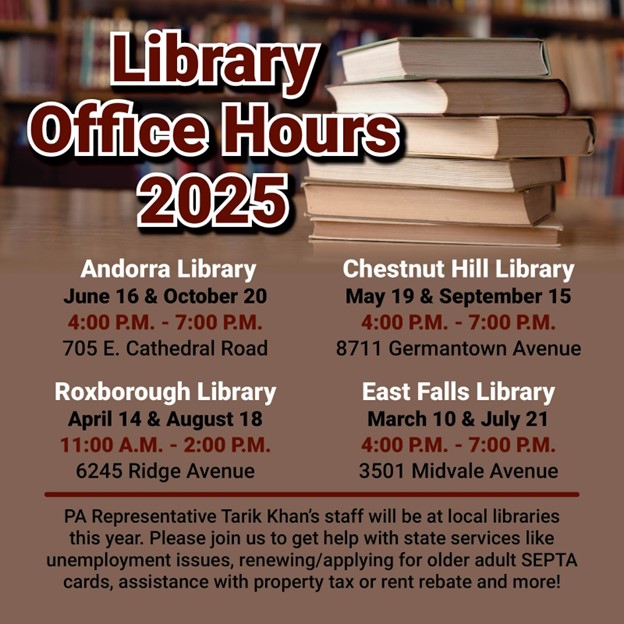 I’ve seen firsthand the emotional toll this uncertainty takes on families at risk of losing their care. We cannot afford these reckless cuts. | Major Cuts to the Department of Education | On top of the looming healthcare crisis, Washington just slashed nearly half of the U.S. Department of Education staff — jeopardizing special education funding, student loan management, and critical grant programs like Pell Grants. Governor Shapiro and the Pennsylvania Department of Education are working to minimize the damage, and as your state representative, I will fight against any cuts to public education. As mentioned, I am committed to securing over $136 million in additional funding for our Philly public schools this year, including special education services. The White House also ended the Local Food for Schools Program, which brings fresh and unprocessed food to Philadelphia schools. Last year, PA students received nearly $7 million in federal funds from this program. Please know that as your state representative and as a member of the PA House Appropriations Committee, I will do everything I possibly can to stop Washington's attacks on public education, our healthcare, our veterans, our environment, and whatever else is on their chopping block. If you have concerns about federal programs or policies, contact your representatives below: | Image: Flyer with information about federal government contacts | | A Local Leader on Our Side — Appropriations Chair Jordan Harris | On March 6th, we wrapped up three weeks of appropriations hearings, during which we explored our state's planned investments for the future. Thank you to our Majority Appropriations Chair, Representative Jordan Harris, who graciously assigned me to this committee in January, along with our Speaker of the House, Joanna McClinton! | Image: Moving into my office two years ago, with Chairman Jordan Harris | Chairman Harris, who represents the 186th District, which covers South and Southwest Philadelphia, is a former Philadelphia public school educator and led the passage of PA’s historic Clean Slate Law. Harris also authored and was the lead prime sponsor of our law last year, increasing security grants to nonprofits at risk for hate crimes by $5 million! | Image: On the House floor earlier this month, with Chairman Harris | Harris is also leading our efforts at the bargaining table with Majority Leader Matt Bradford and Speaker McClinton to bring, among other things, a $15 minimum wage, fully funding Philly schools and the steady stream of funding SEPTA needs. Thank you, Chairman Harris!! Read on for information about our upcoming events in the community — otherwise, I hope to see you soon! | Welcome to Mutt Madness, Library Hours & Shredder Day! | Spring is around the corner, and some exciting community events are lined up! Mark your calendars and stay tuned for more details. | 🐶 Mutt Madness Pet Adoption Event | Saturday, March 2, 11 - 2 pm at Roxborough Pocket Park (6170 Ridge Ave) Are you looking to welcome a new furry friend into your family? Mutt Madness is the perfect opportunity! In coordination with Roxborough Development Corporation and ACCT, we are working with local rescues to bring adorable, adoptable pets in search of their forever homes. | Image: In La Noce Park with a goldie named Willow (not up for adoption!) and Willow’s human Kevin | Image: RepTar hanging out on a desk in a video about the last Shredder Day | Need help with state services? Whether it’s PennDOT paperwork, rent rebates, or any other issue, our team will be on hand to assist you—no appointment is needed! The next session is at the Roxborough Library (6245 Ridge Avenue) on April 14th, 11:00 am to 2 pm. My staff will help you get the support you need! | Image: Flyer with information for each of the upcoming office hour events | COMMUNITY UPDATES Follow us on Social Media FB/Twitter/TikTok: @RepTarik Insta/Bluesky: @RepTarikKhan | Pennsylvania State Capitol 121-A East Wing Harrisburg, PA 17120 (717) 783-4945 | District Office 4001 Main St., Suite 101 Philadelphia, PA 19127 (215) 482-8726 | |