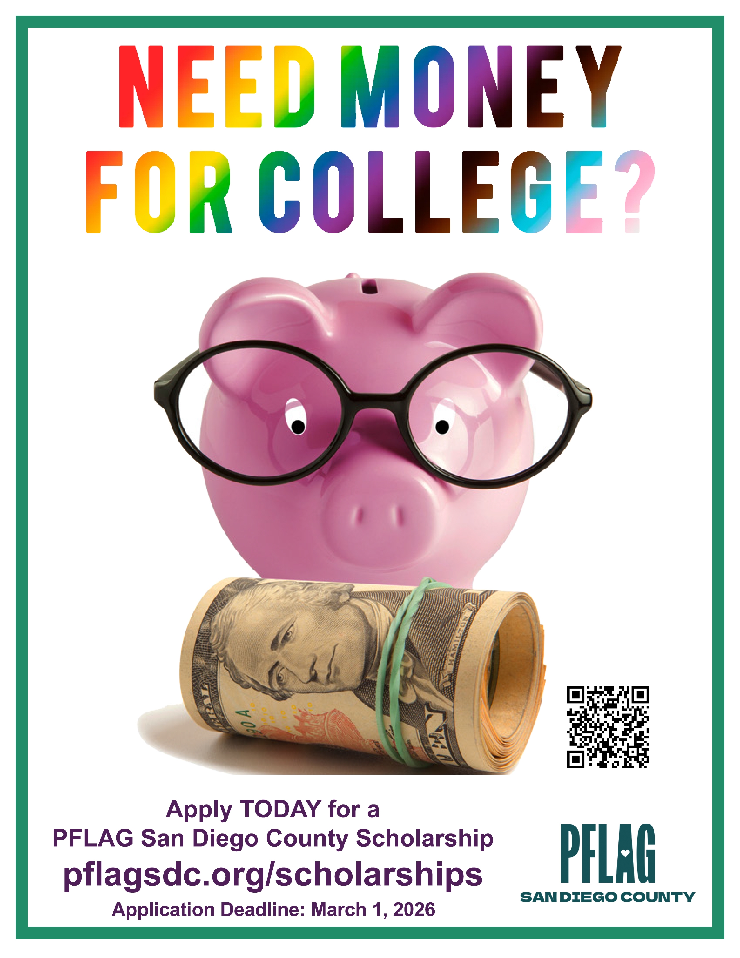PFLAG San Diego County is awarding up to 25 scholarships to LGBTQ+ seniors in high school, undergraduate, and graduate school who reside in San Diego County based on their commitment to their chosen field, financial need, and academic achievement. In addition to general scholarships, there are specific scholarships offered in the following areas: STEM, Art, Education, Health Services, Community College, and Vocational Studies. The application deadline is March 1, 2026. To learn more or apply for a scholarship, click the button below.