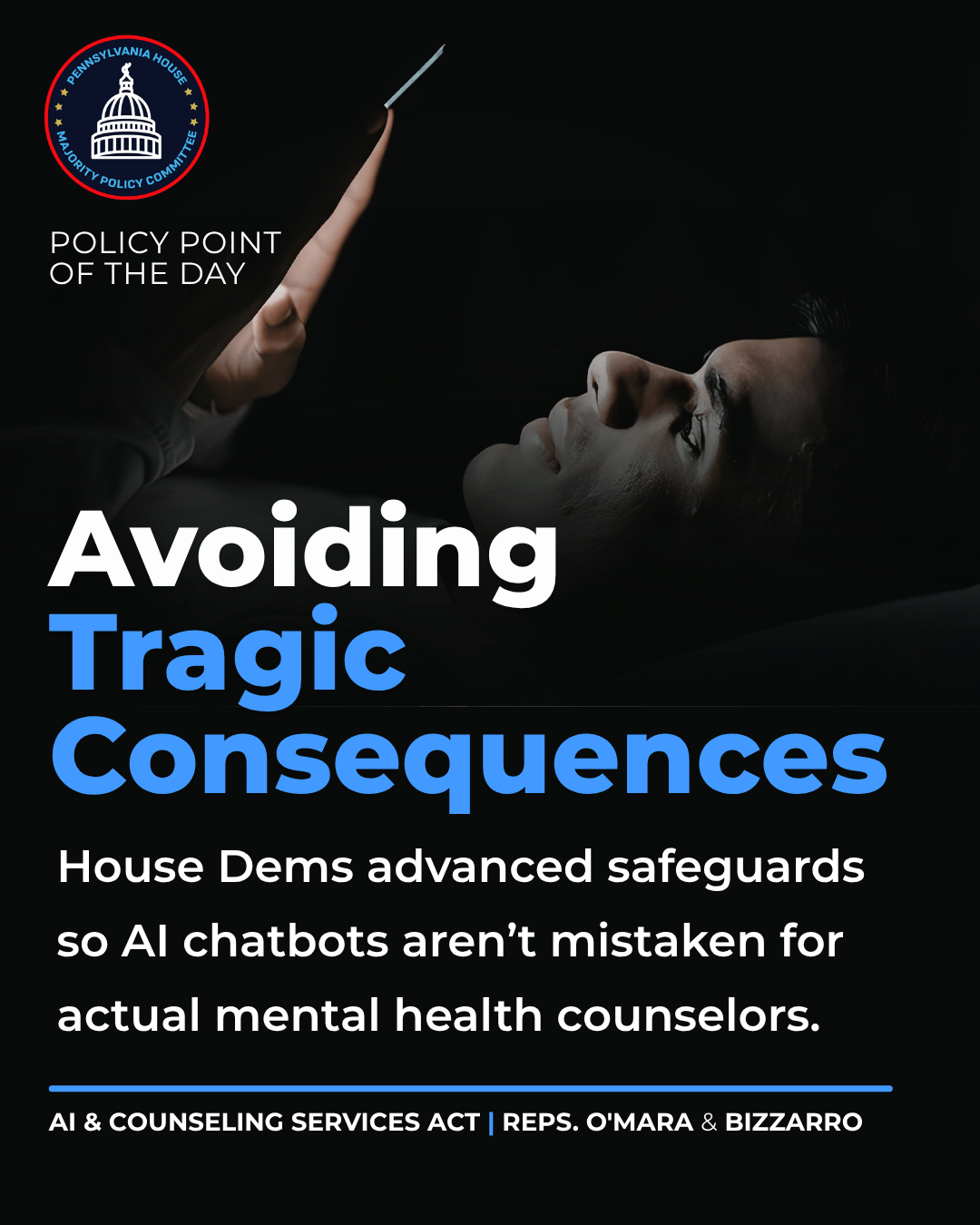 The Policy Committee recently held a hearing on our House bill to put guardrails on AI to protect young people and people in need who haven't yet reached out to a counselor.