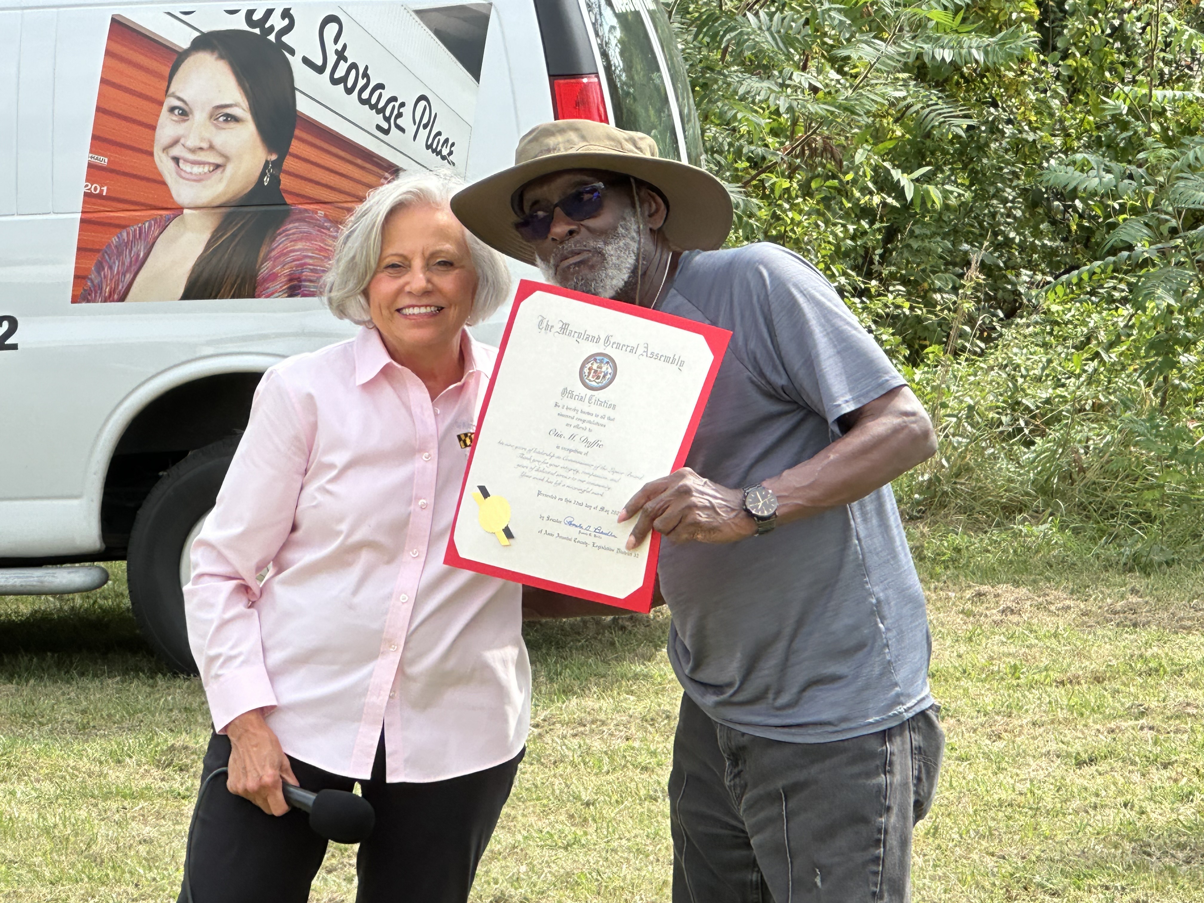 I was delighted to present a Senate Citation to Mr. Otis Duffie to thank him for serving 8 years as a Commissioner on the Anne Arundel County Liquor Board. Mr. Duffie is the ultimate volunteer in our community, especially at St. Mark's Church and the West County Democratic Club.