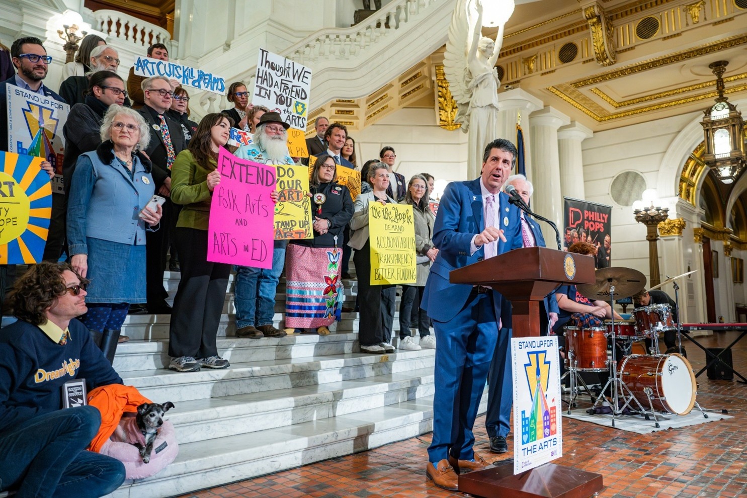 In the Capitol Rotunda, I joined artists, educators, and cultural leaders to call attention to the arts and cultural sector's $30 billion annual economic impact on the Commonwealth. The goal is to increase state funding for the arts and to raise awareness about the economic and cultural impact of the creative sector on the state's economy. Arts funding stimulates local economies, supports downtown revitalization, and sustains creative jobs.