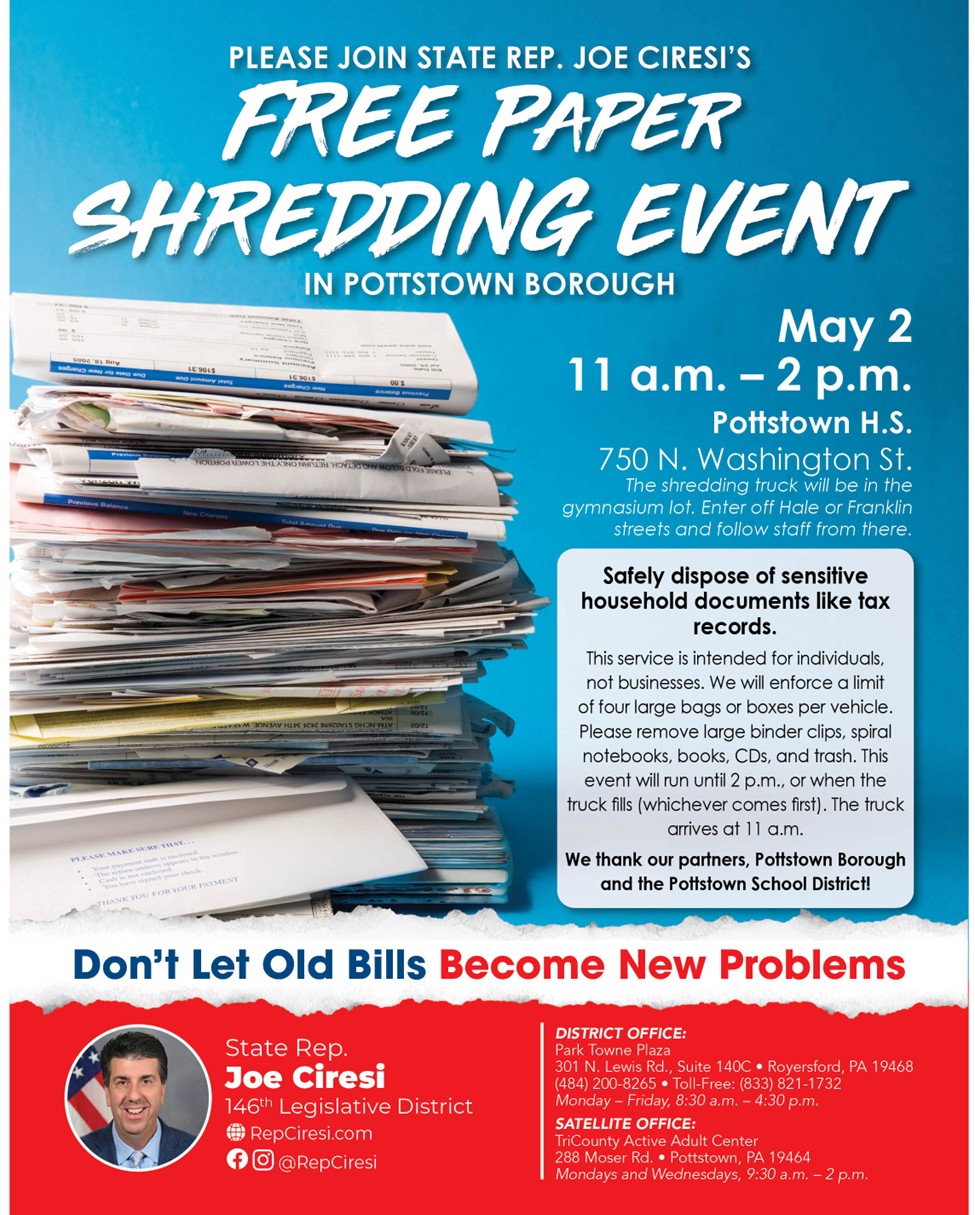 - Spring Shredding Event with Pottstown Borough and the Pottstown School District, Saturday, May 2 from 11 a.m. to 2 p.m. at Pottstown High School (750 Washington Street)