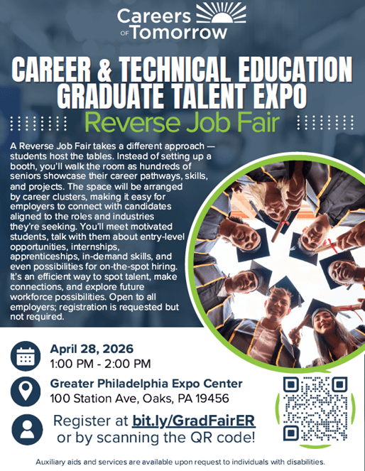 - Tuesday, April 28 - the Workforce Development Board for Montgomery County will be hosting a reverse job fair at the Greater Philadelphia Expo Center from 1 to 2 p.m. This is where students staff the tables, and industry representatives walk around to speak with them.