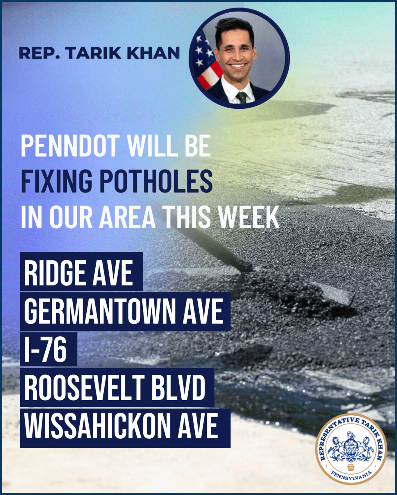 PennDOT’s fixing potholes this week on Ridge, Germantown, I-76, Roosevelt, and Wissahickon.