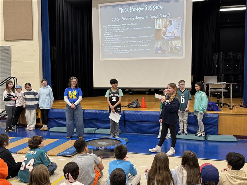 On Thursday, we kicked off this year’s Fourth Grade Tour at Shamona Creek Elementary, followed by a visit to Lionville Elementary on Friday. I had a great time helping students learn the difference between the state and federal governments, how an idea becomes a bill and a bill becomes a law, and how to be active and make their voices heard. We even had time for a mock House session where we debated and voted on my legislation that would require schools in Pennsylvania to provide thirty minutes of recess and thirty minutes of lunch for all students in grades K through 12. Our Speaker of the Fourth Grade House did an excellent job keeping our members in order while conducting the business of the House, and the bill passed with majority support.