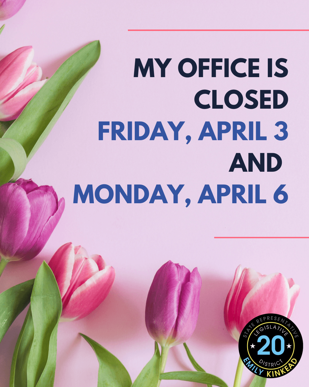 Leave us a voicemail at 412-321-5523 or email RepKinkead@pahouse.net and we’ll get back to you when we return on Tuesday, April 7.