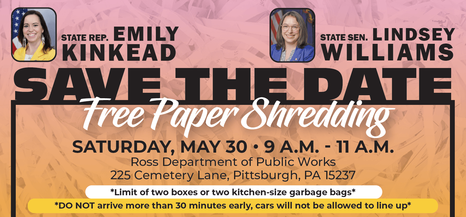 You’re invited to my free document shredding event in Ross Township on Saturday, May 30! This is a great opportunity to safely destroy documents containing personal data and reduce paper clutter. My staff and I will be on-site helping folks shred, offering data security tips, and information on resources available from the state.