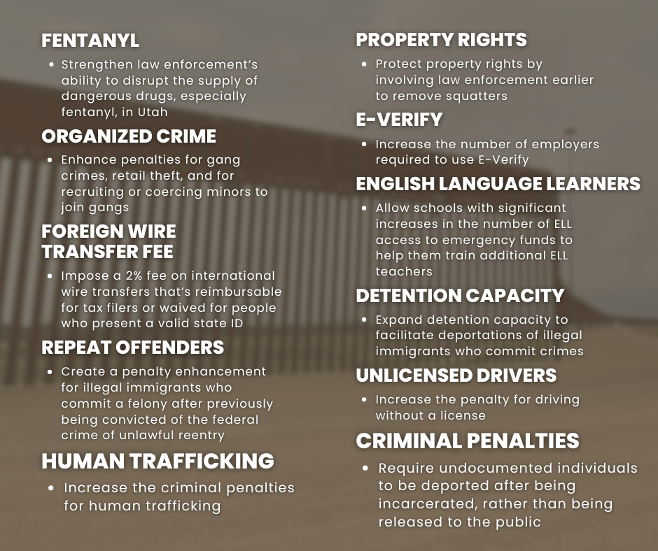 The Biden administration’s inaction at the Southern border has strained our communities, public safety, and education systems. While supporting legal immigration, we must protect our communities. That’s why we’re introducing bills to hold accountable criminals that are here illegally, including stricter penalties for fentanyl trafficking, recruiting minors into gangs, driving without a license, and other crimes. By taking these steps, we are reinforcing our commitment to both the rule of law and the safety of all Utahns.