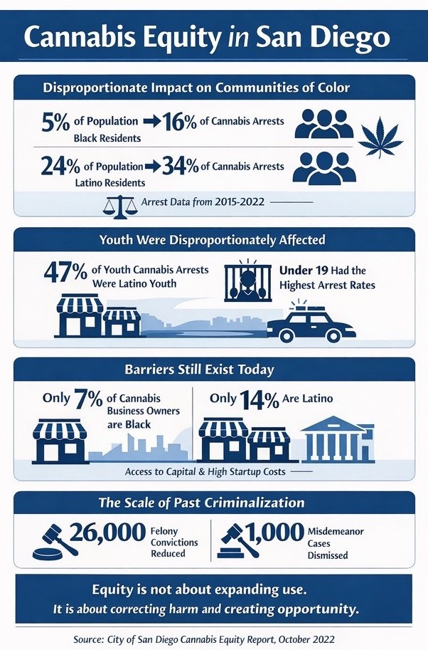 The SEED program is focused on addressing the impacts of past cannabis enforcement and creating pathways for economic opportunity in communities that have been historically harmed and excluded from the legal market. In San Diego, Black residents make up about 5 percent of the population but accounted for 16 percent of cannabis related arrests, highlighting the disproportionate impact on communities of color.