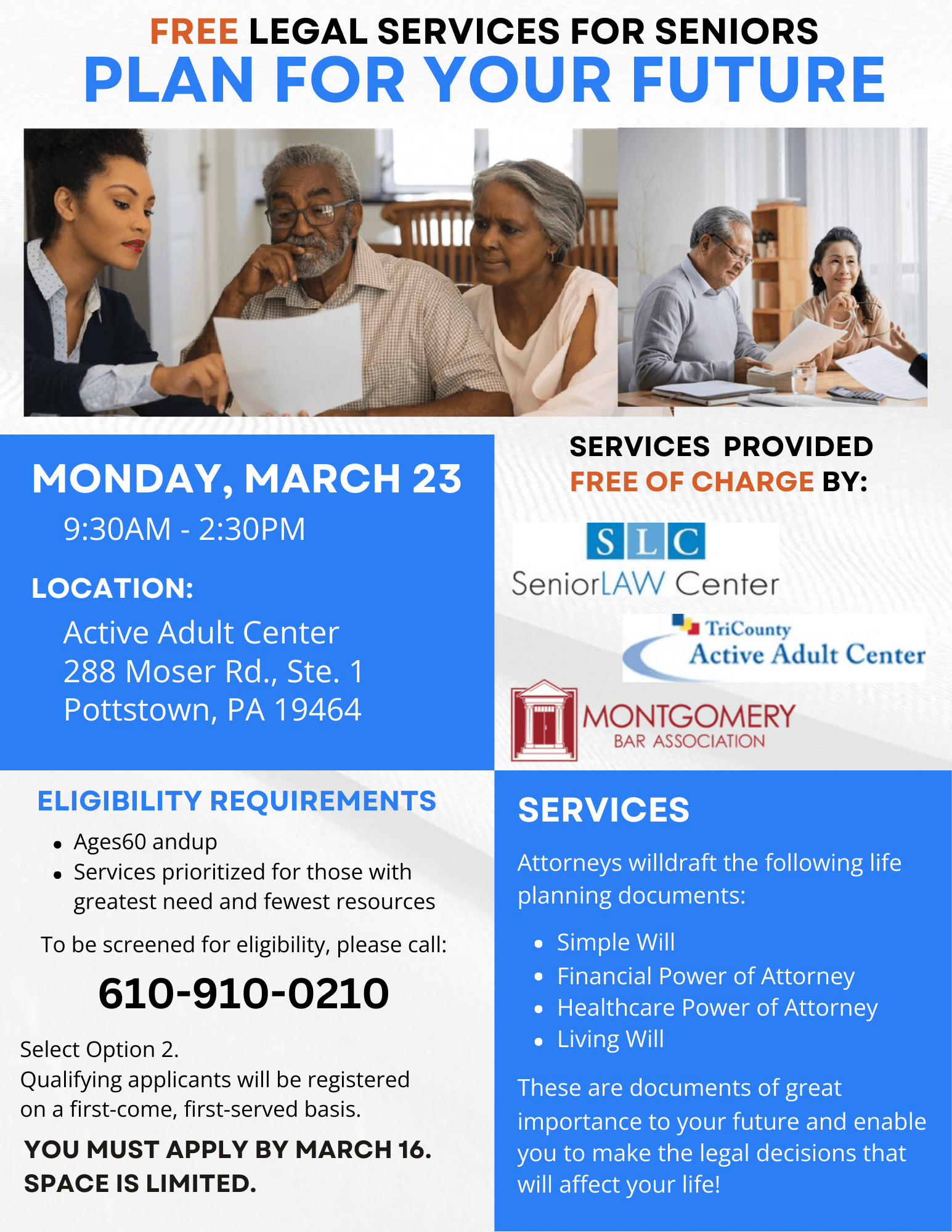 Senior LAW Center is partnering with the Montgomery Bar Association and Tri County Active Adult Center to draft life-planning documents, including simple wills, financial powers of attorney, healthcare powers of attorney, and living wills, for Montgomery County older adults, free of charge.