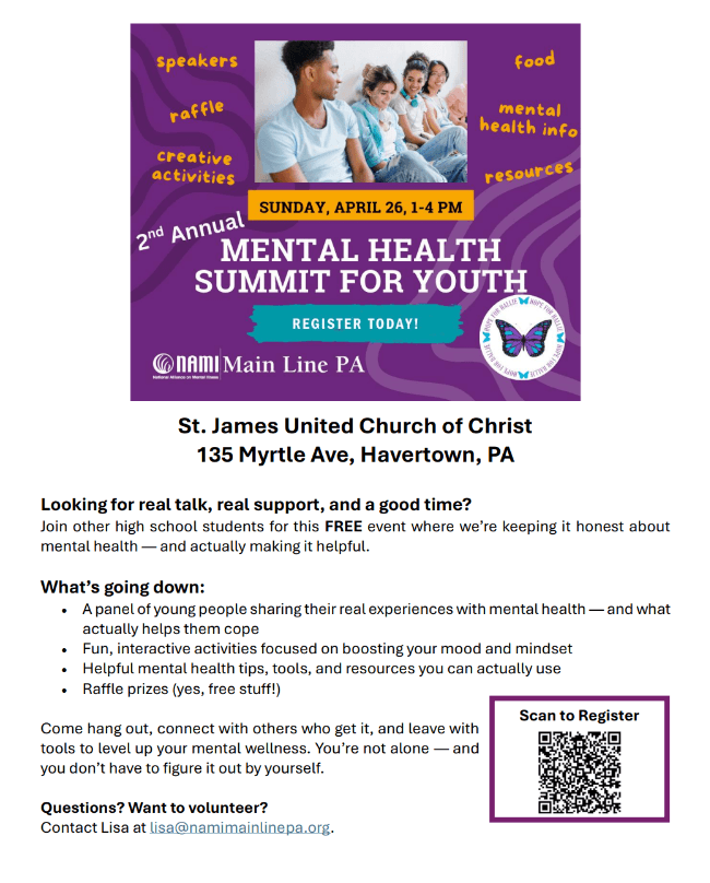 Join us April 26th at 1pm at St. James Church in Havertown for this FREE Summit for HIGH SCHOOL YOUTH including: