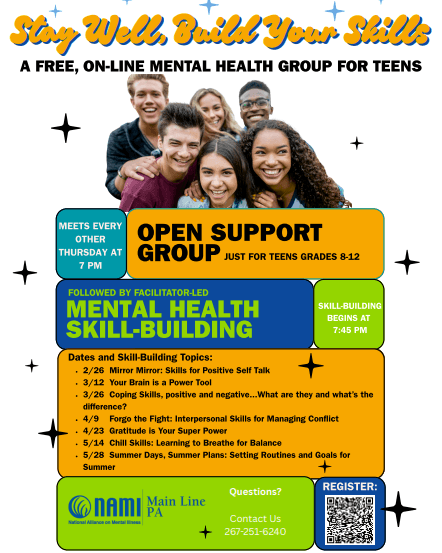 The first half of these 90-minute sessions will consist of an open support group. The second half will feature a presentation/discussion with a mental health professional or peer about a specific mental health skill. This group will meet on Zoom every other week on Thursday nights through May 28. The next session will be Thursday, April 9th at 7pm.