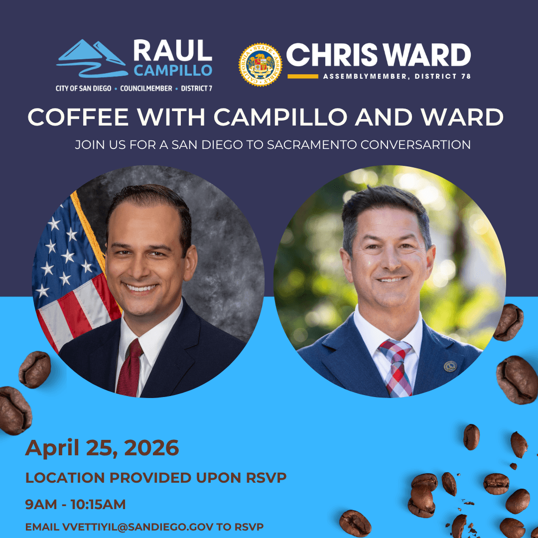 Here’s another reminder that I’m hosting my first Coffee with Campillo, a joint event with Assemblymember Chris Ward, to hear your ideas, concerns, and questions about the City. This is one you will not want to miss.
