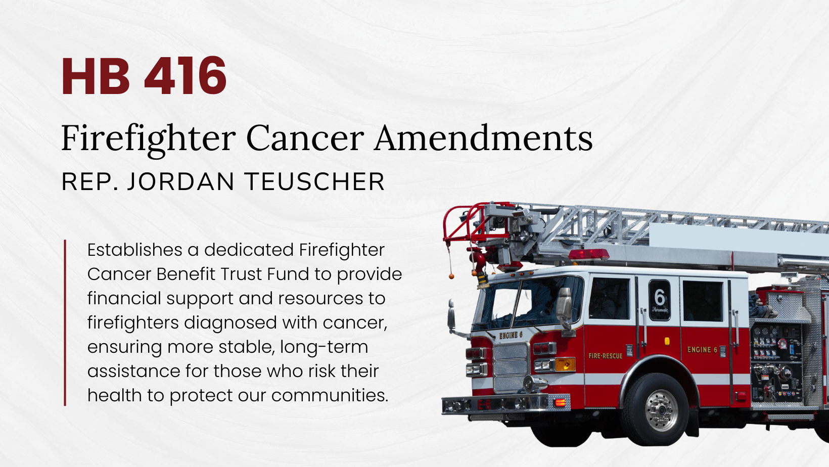 Our firefighters put their lives on the line for us every single day, and they deserve more than just our gratitude — they deserve our support. That’s why we passed H.B. 416 Firefighter Cancer Amendments, which builds on groundbreaking cancer screening legislation from last year by creating a dedicated Firefighter Cancer Benefit Trust Fund to provide benefits to firefighters who develop job-related cancers. This legislation leverages existing funding, ensures responsible oversight through a board of trustees, and builds a self-sustaining structure to support those who have sacrificed so much for our communities. I’m deeply grateful for our firefighters and proud to stand by them and their families when they need it most.