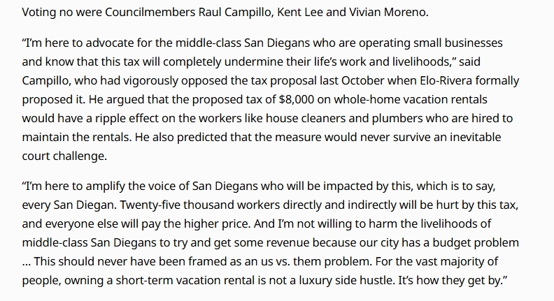 I opposed this Tax when it was first proposed in October for a multitude of reasons. Between legal issues, my concern for middle-class San Diegans relying on their small business income, the potential impact on workers who are hired to care for those rentals, and the inflation it would cause throughout our City, I could not support the ballot measure. I was also uncomfortable with its framing as an ”us versus them” problem, a framing that overrode the need for honest conversations about impacts and implementation issues. This proposal failed 3 votes to 2.