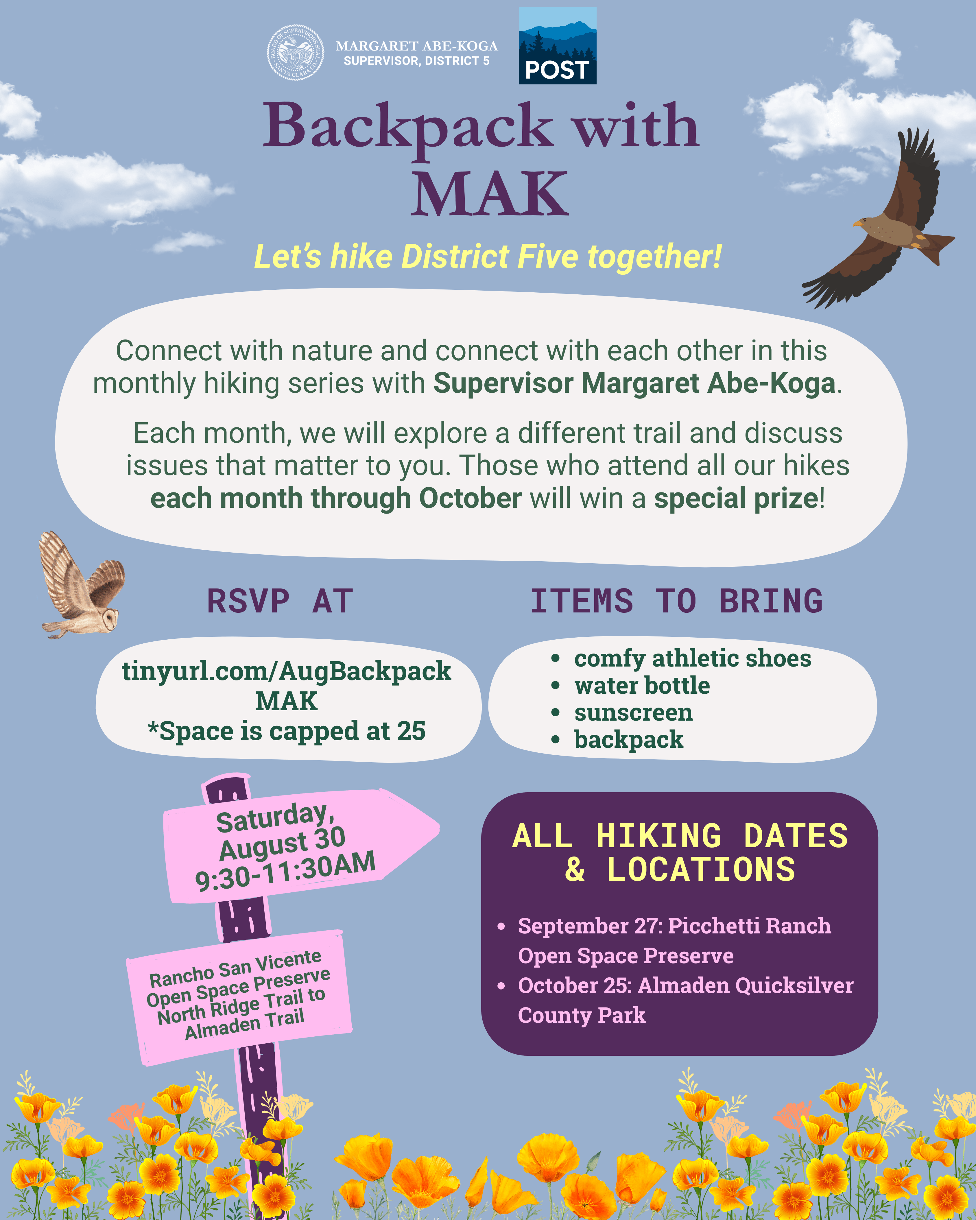 If you’ve joined us for previous hikes, don’t miss this one. You will need to complete all five hikes to earn your prize in October!