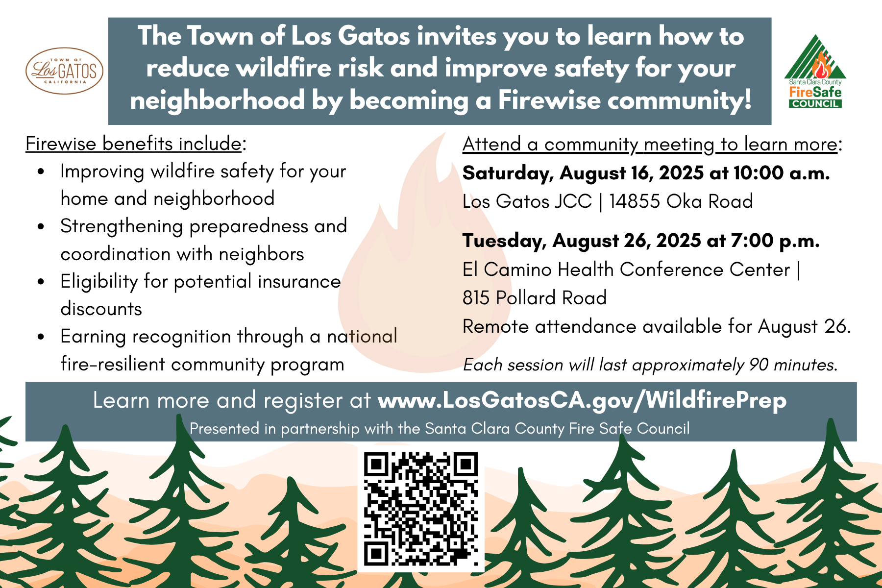 The meeting will be held on Tuesday, August 26 at 7PM at the El Camino Health Conference Center, located at 815 Pollard Road, Los Gatos. A remote attendance option will also be available. Each session runs about 90 minutes. Learn more and register at LosGatosCA.gov/WildfirePrep