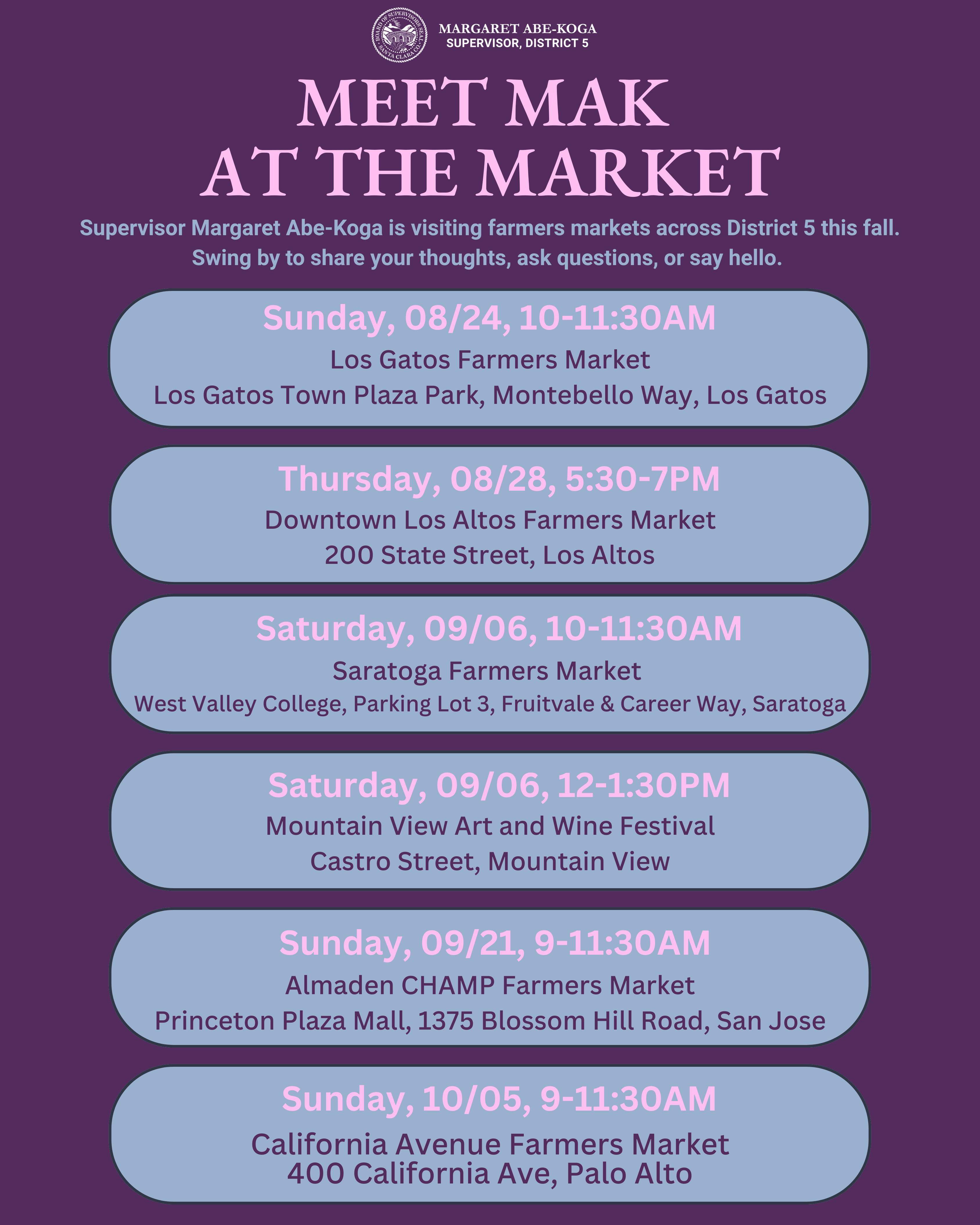 Over the next several weeks, my team and I are tabling at farmers' markets across District Five, and we’d love to see you there. Whether you have a question, a concern, or want to say hello, we’re here to listen, share updates, and build community together.